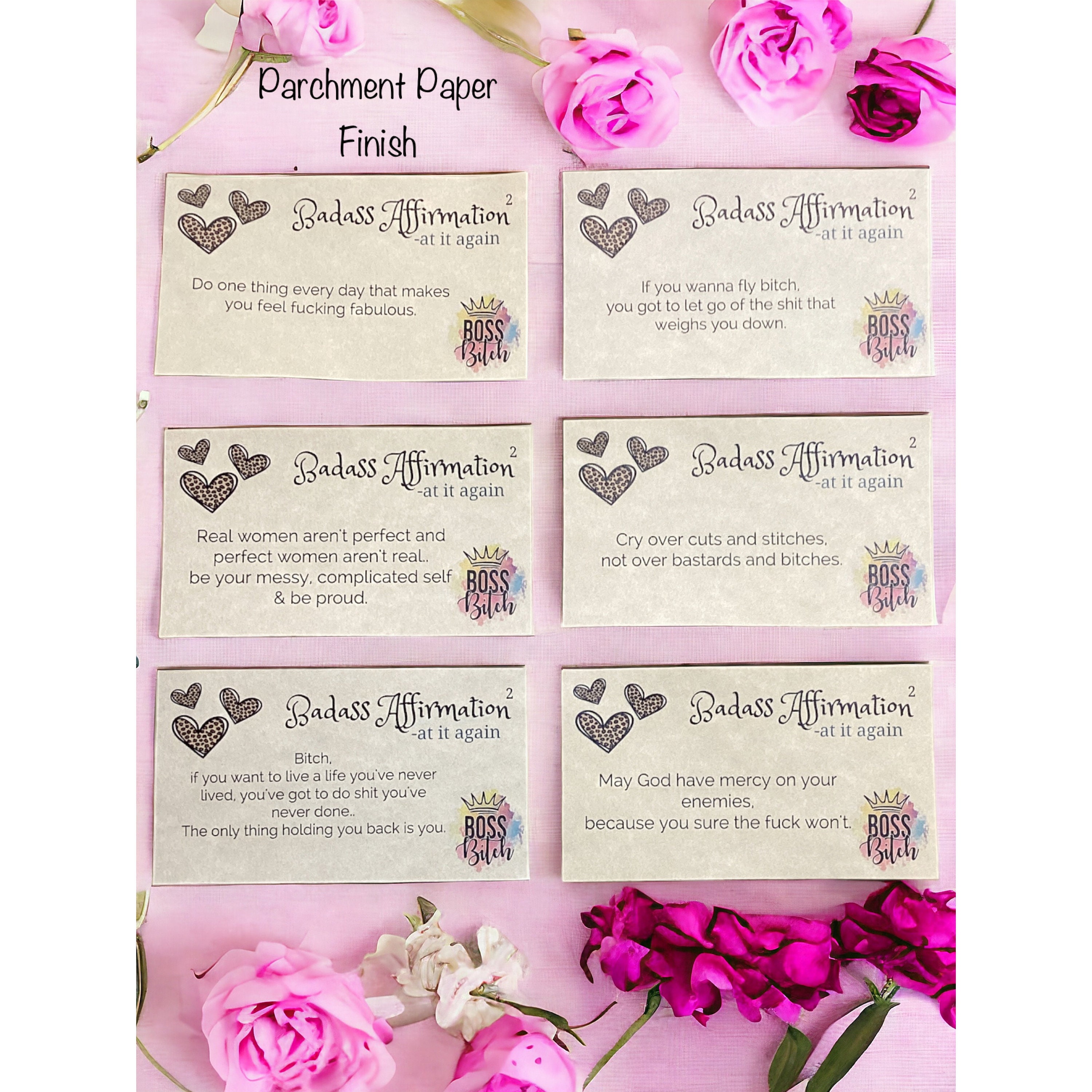 60 empowering affirmations in your choice of paper finish, hand rolled, and secured with a matching elastic band.