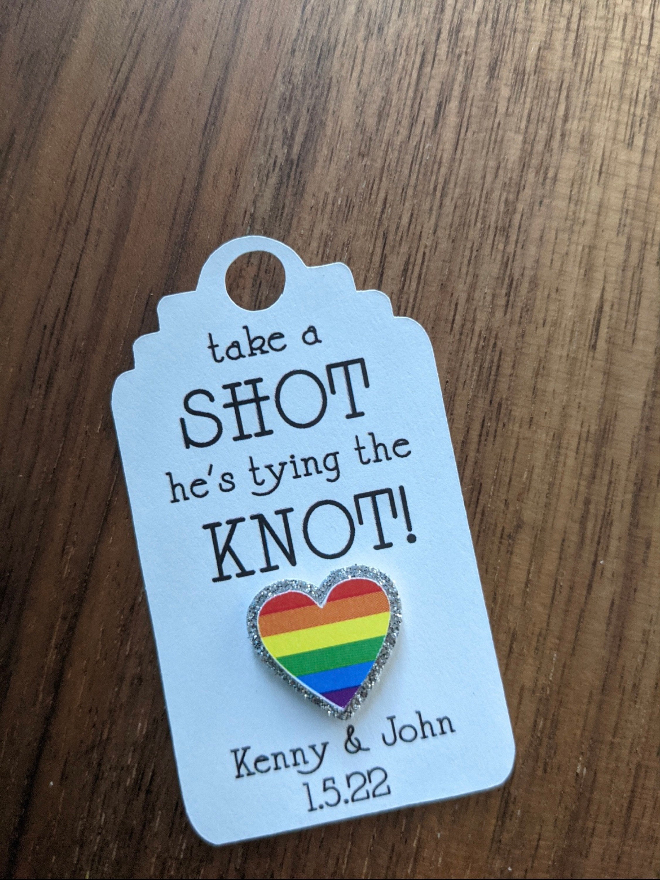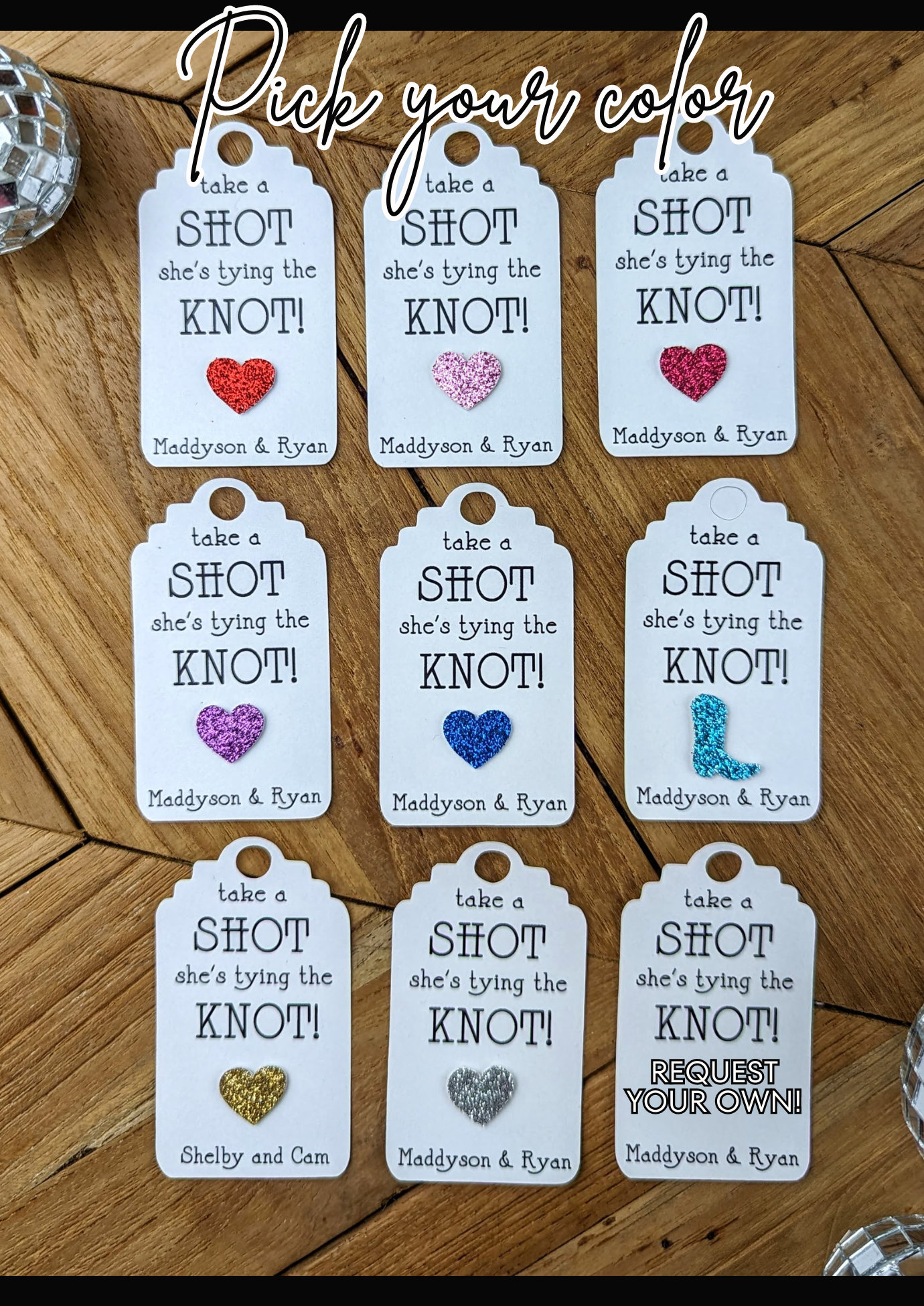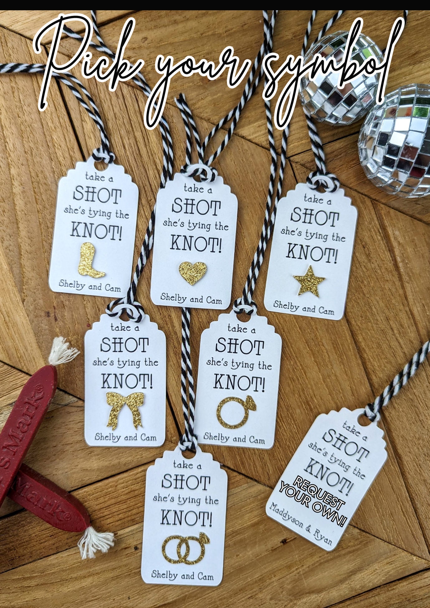 These photo booth tags are personalized with the bride and groom's names and a small symbol. You can choose a symbol from the list provided (cowboy boot, heart, star, ring, interlocking rings), or request your own symbol! The symbols are attached with double-sided foam tape to add a little depth and dimension.