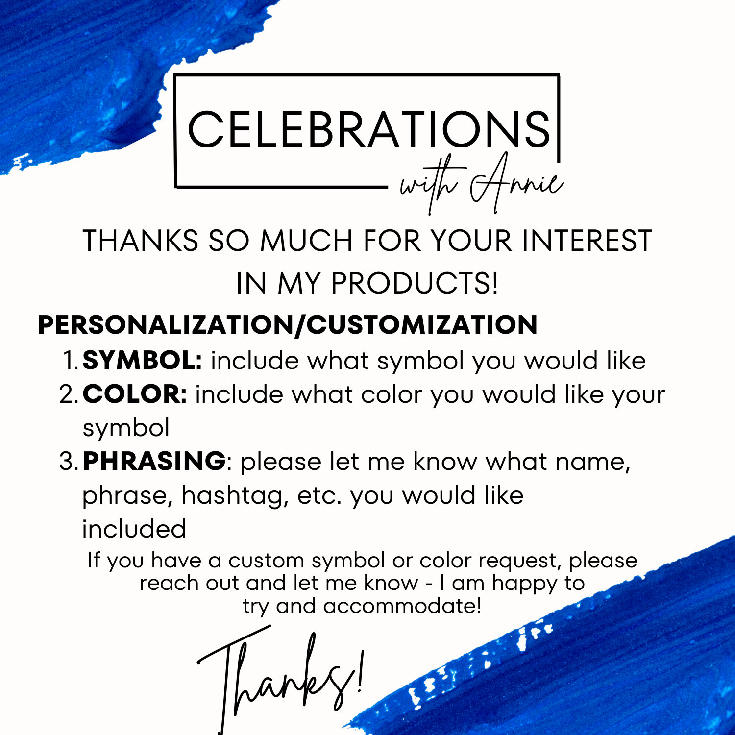 You can also specify the color you want the symbol. These symbols are made from high-quality glitter cardstock and are available in gold, silver, red, hot pink, pink, purple, blue, teal, or custom colors.