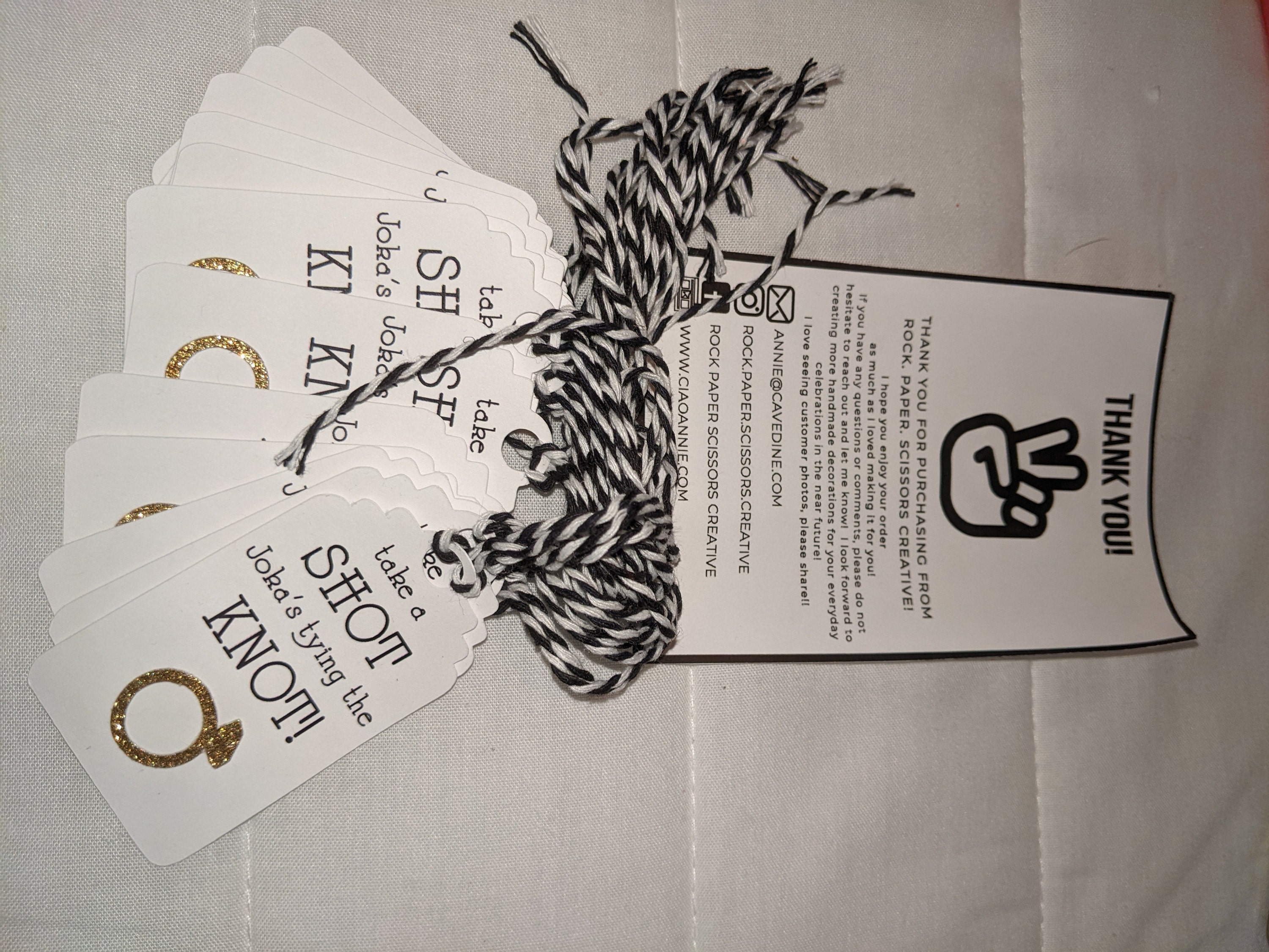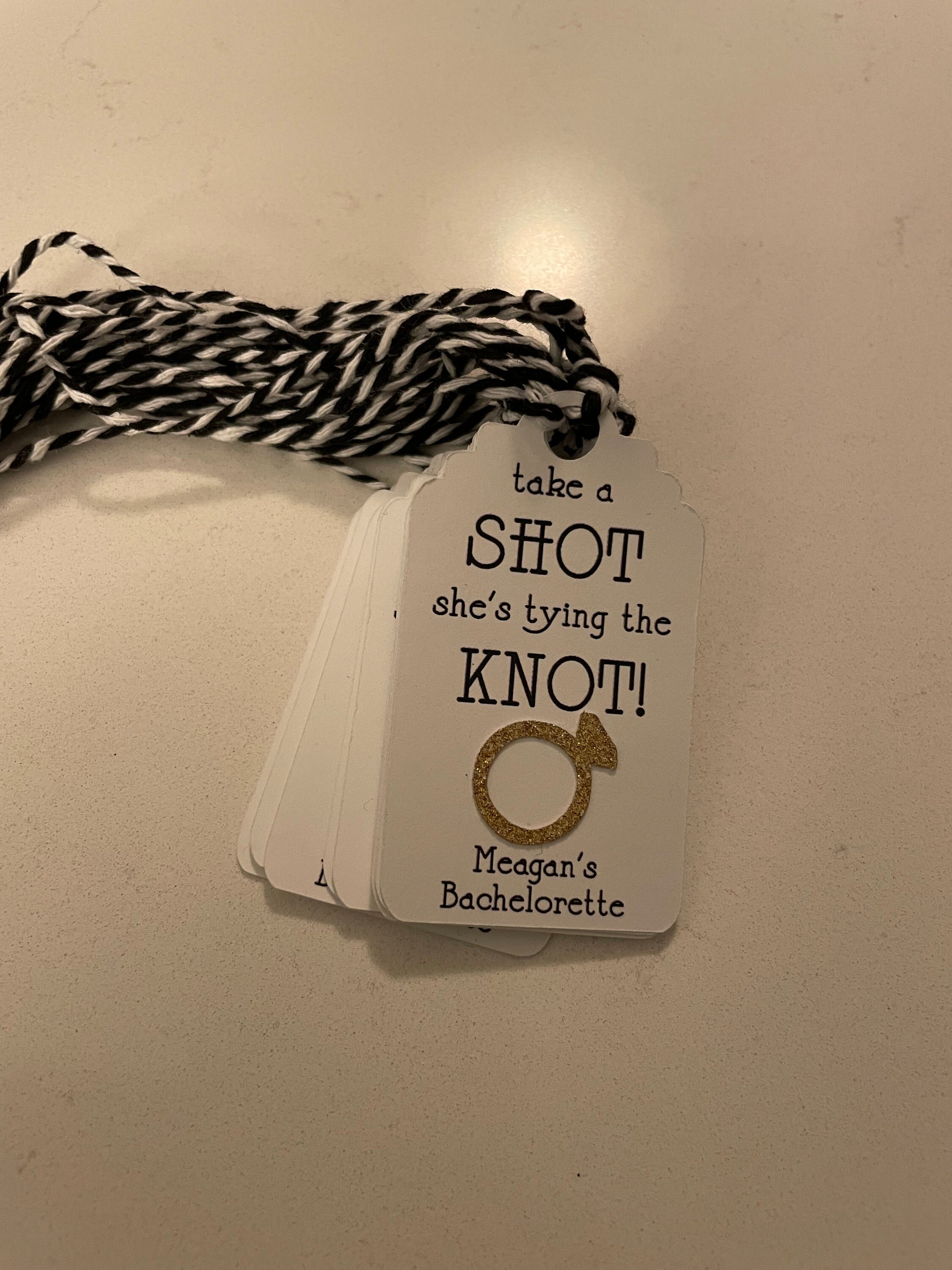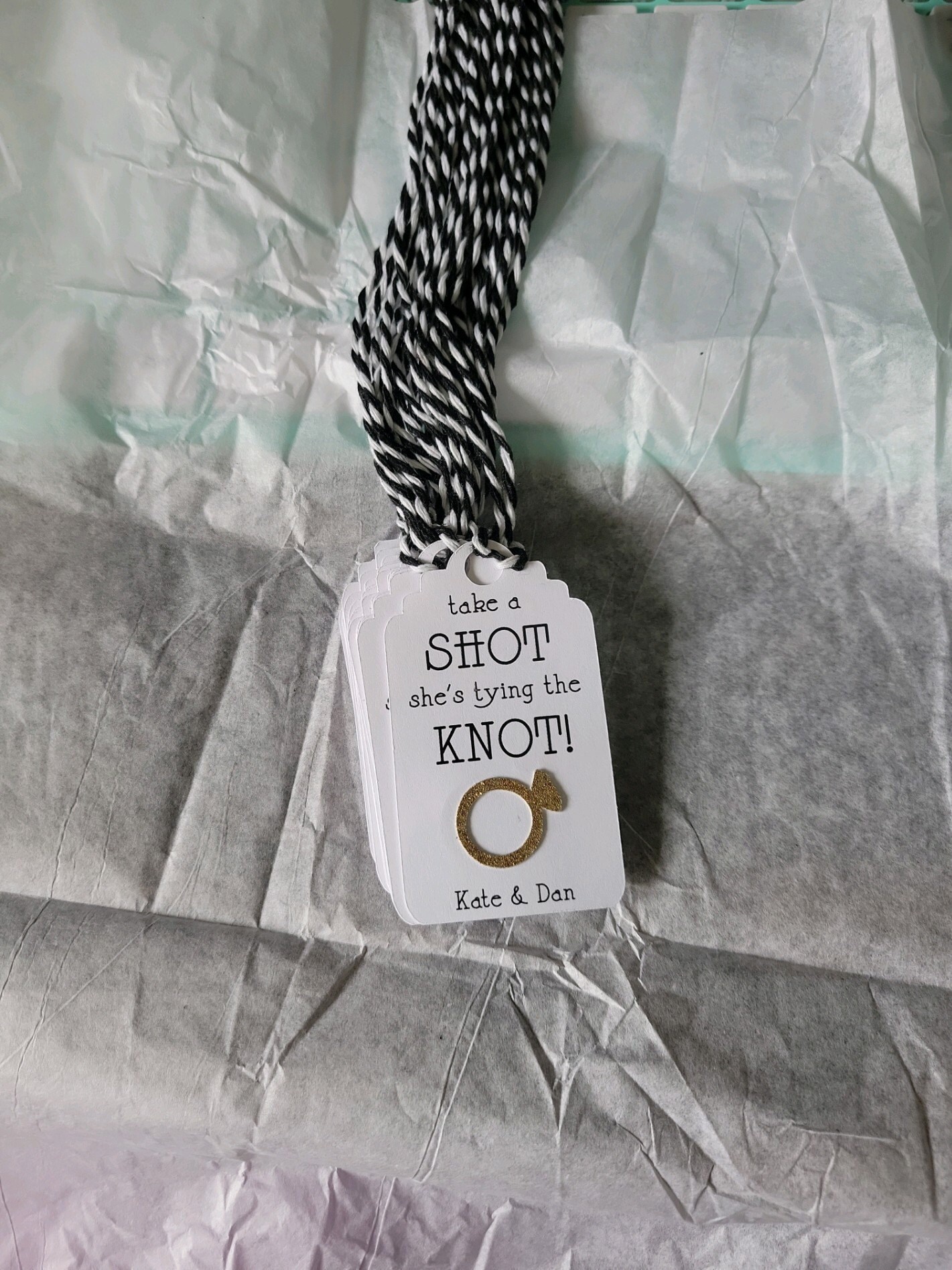 The tags come with black and white baker's twine that you can use to tie the tags to the mini wine bottles.