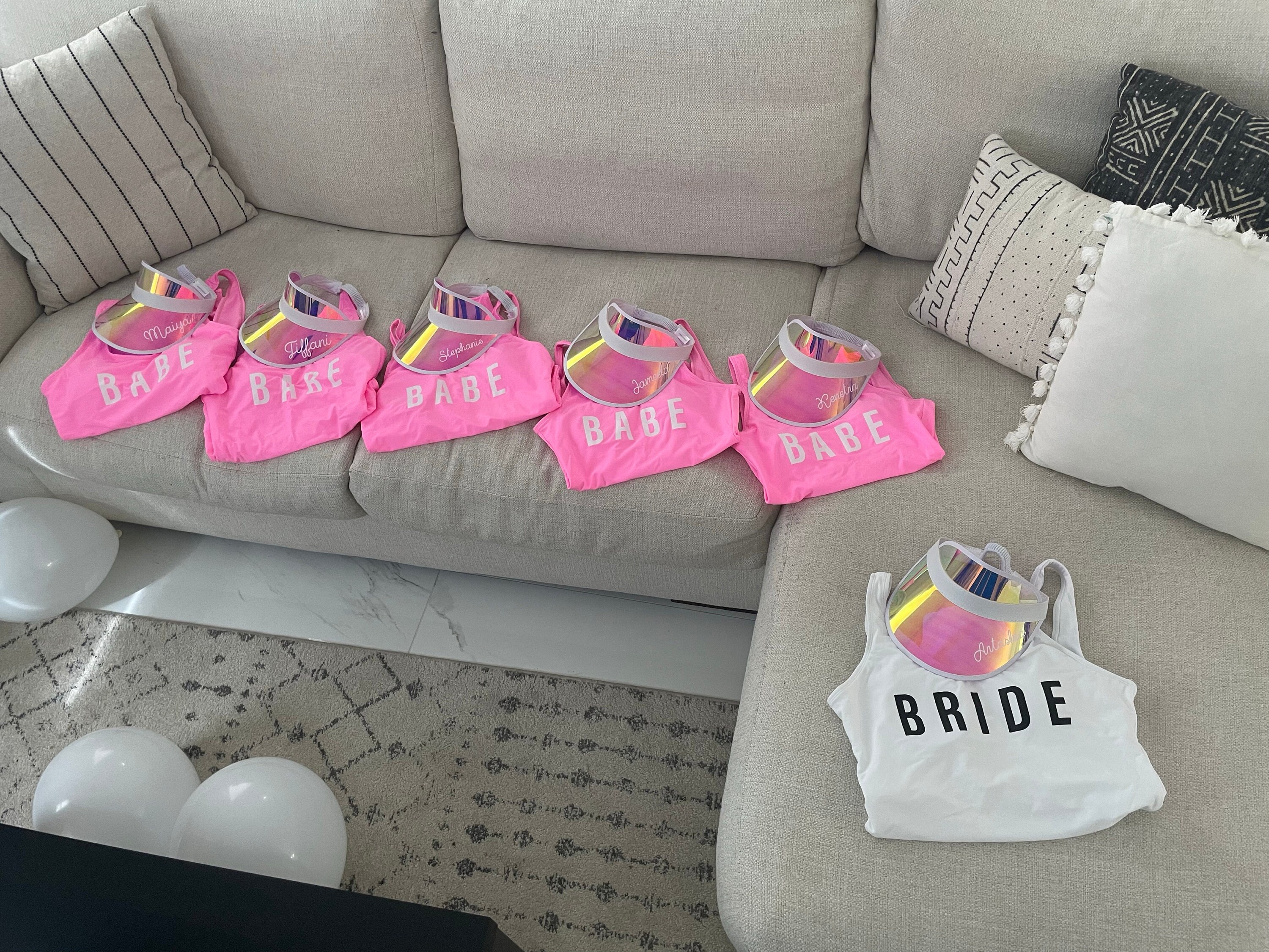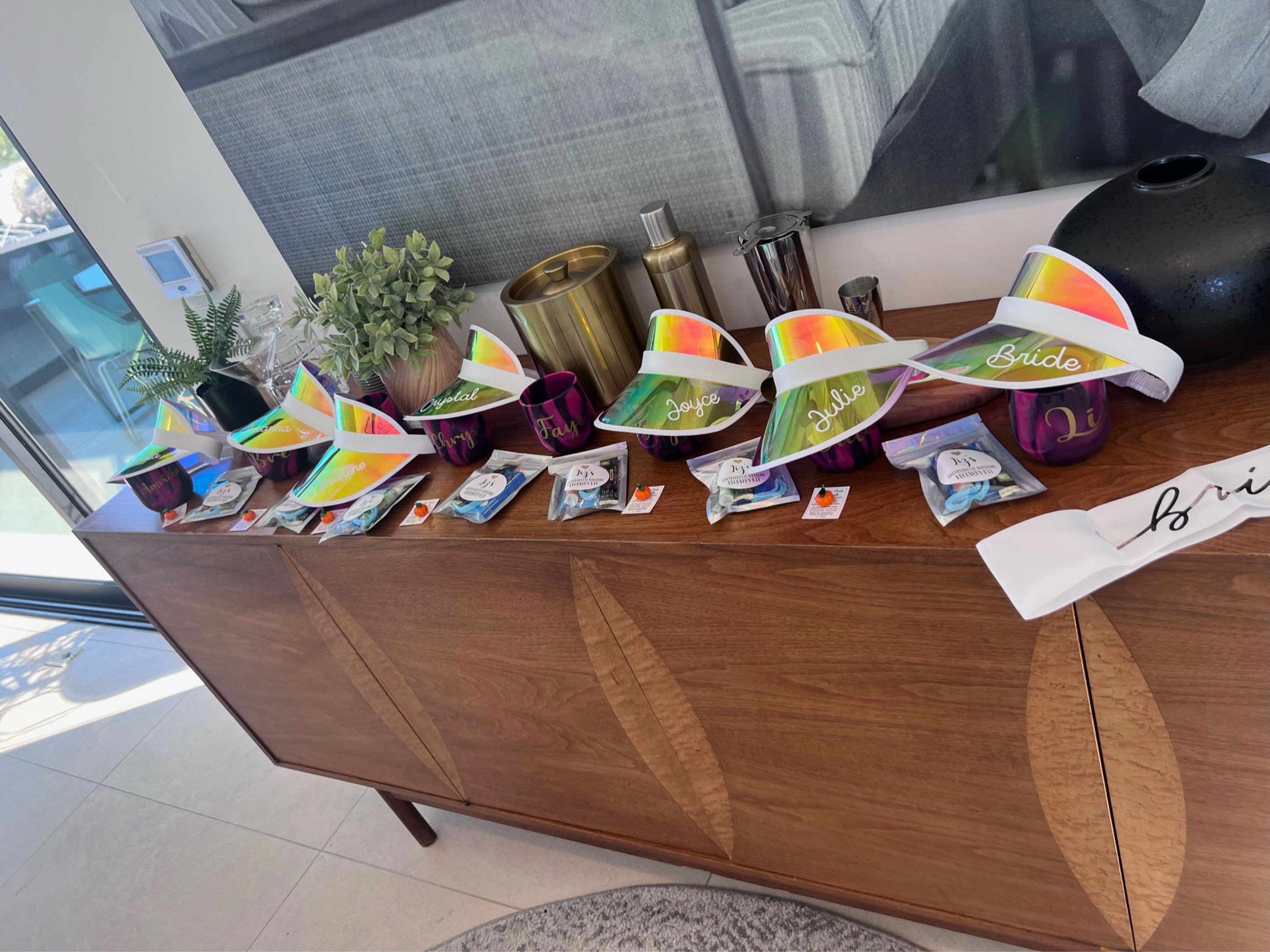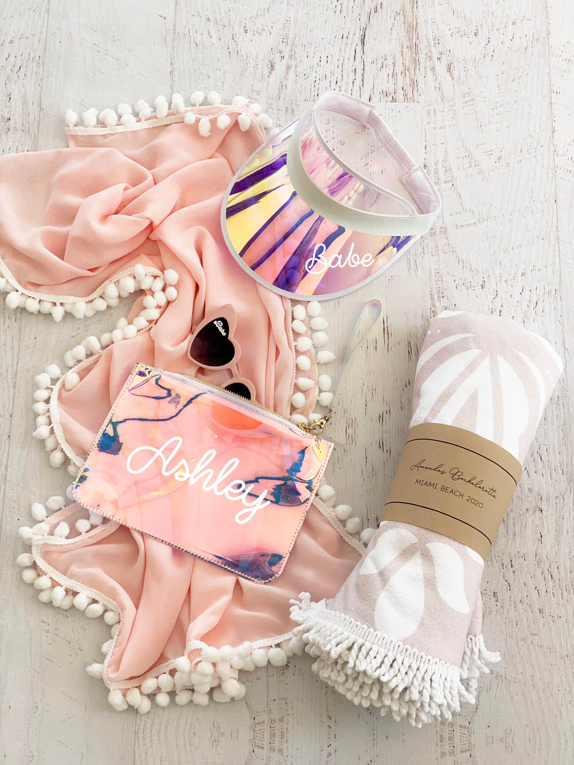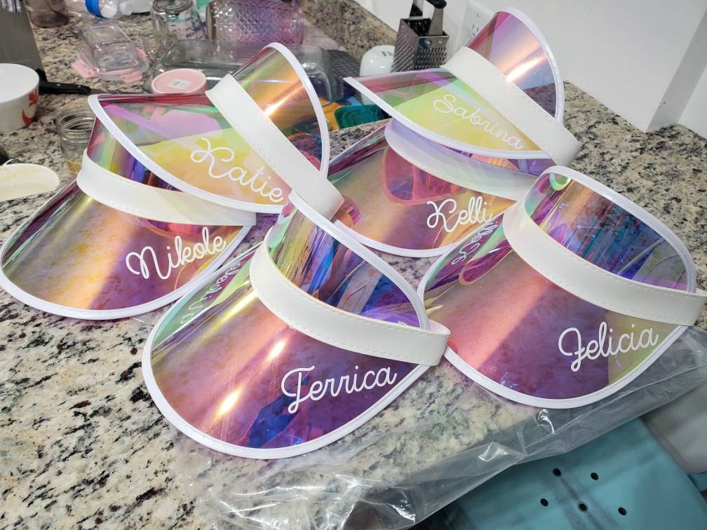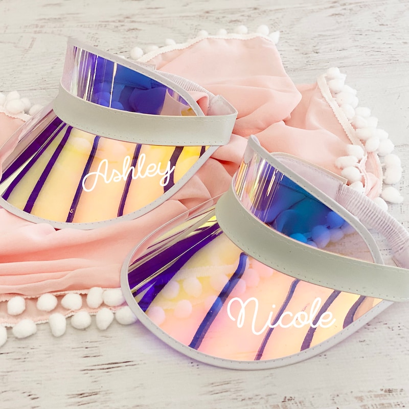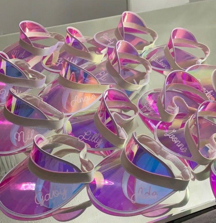 Personalized beach hats are the perfect accessory for your bachelorette party at the pool or beach! Available in white vinyl with bride, baby or custom names, each holographic hat is sure to make your wedding party stand out.