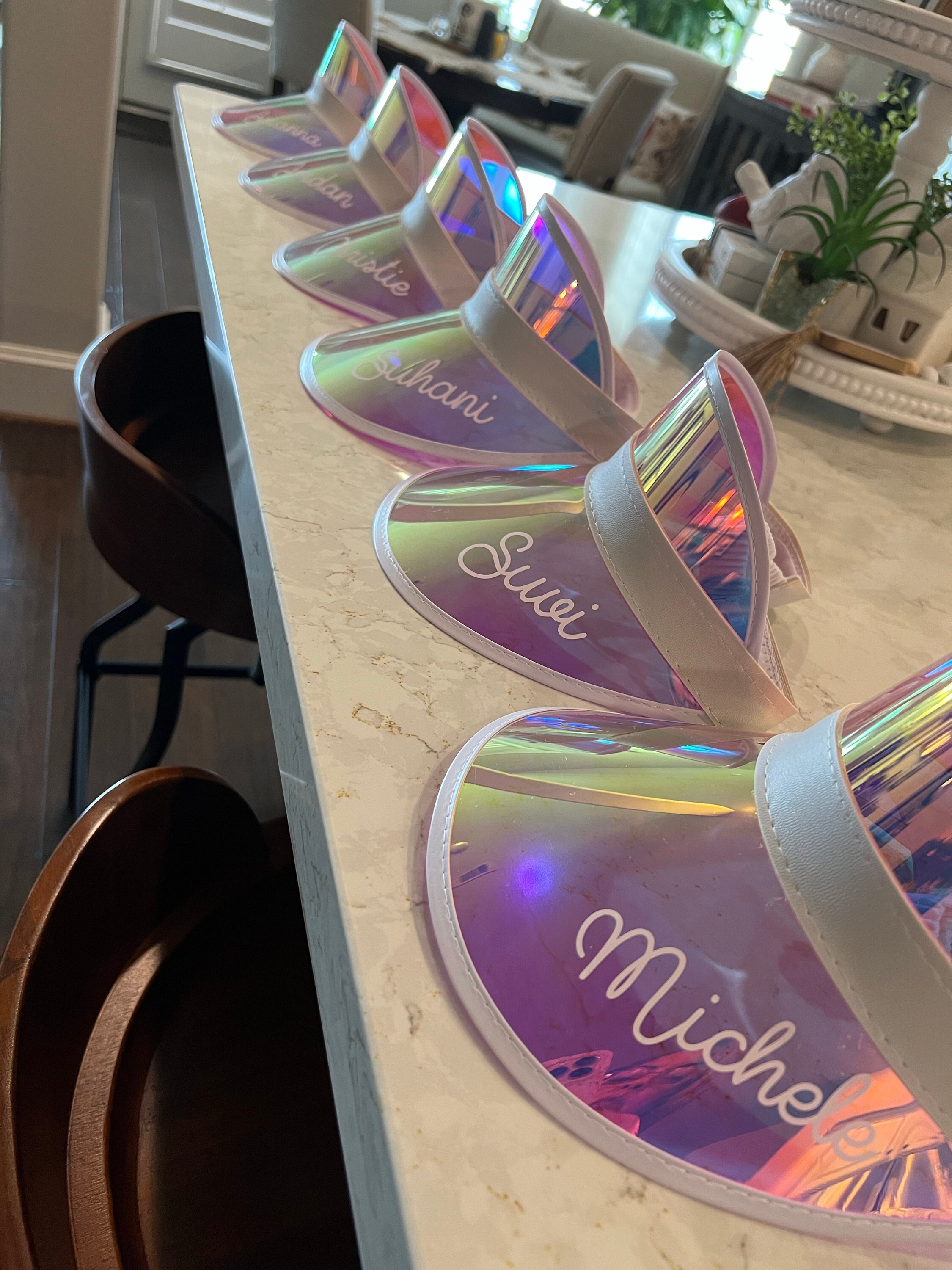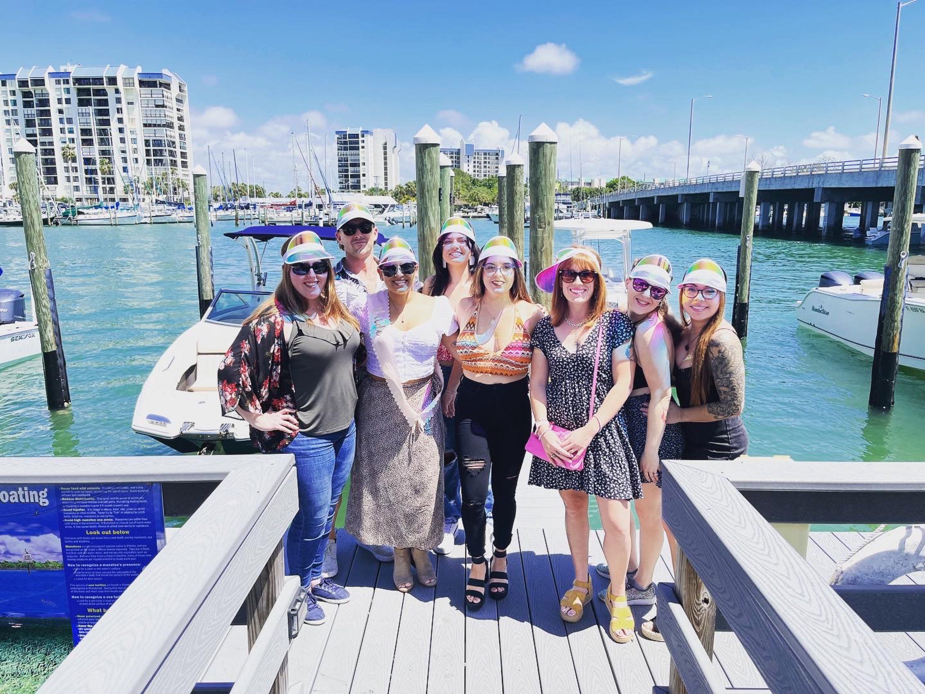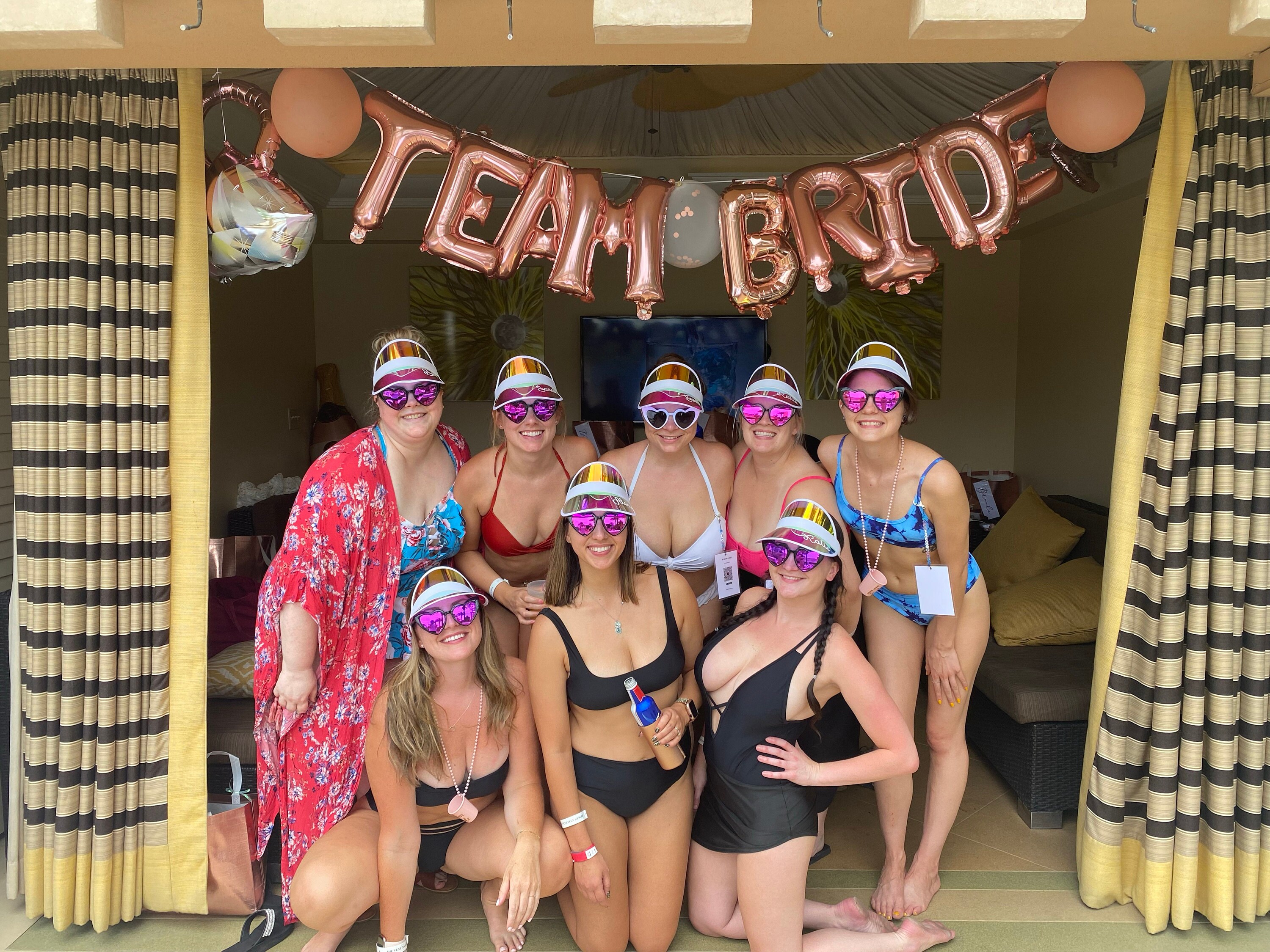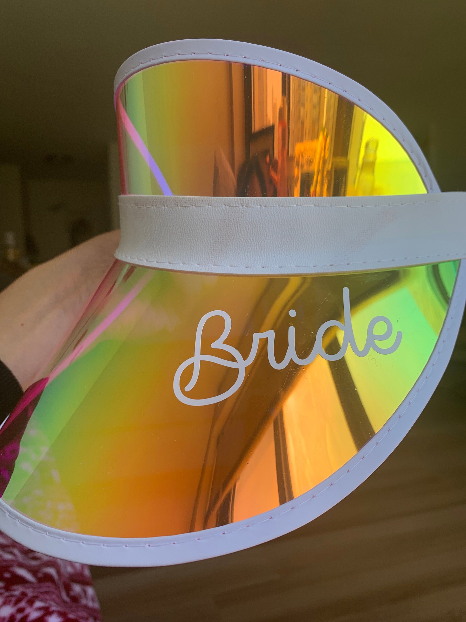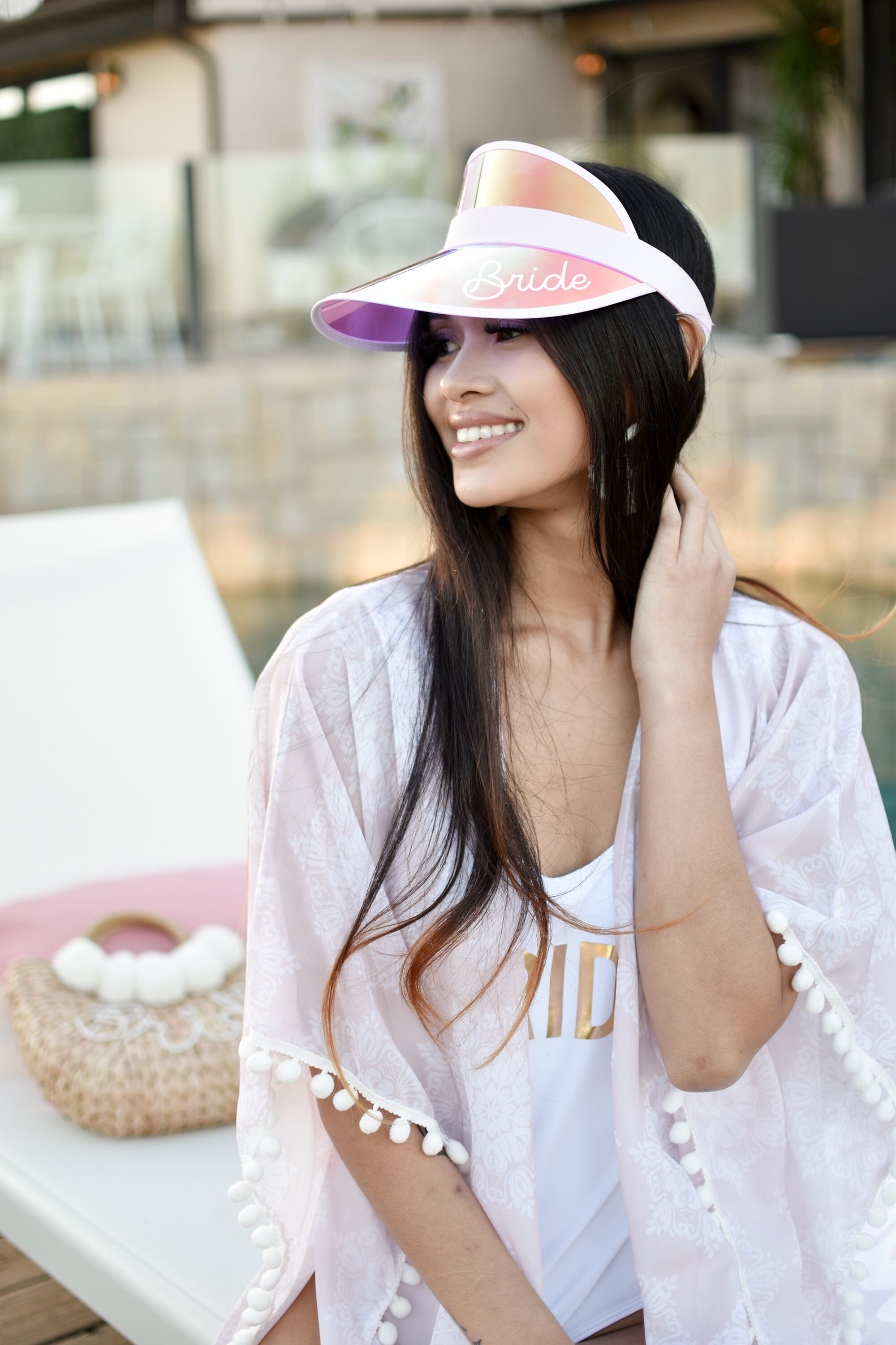 Personalized beach hats are the perfect accessory for your bachelorette party at the pool or beach! Available in white vinyl with bride, baby or custom names, each holographic hat is sure to make your wedding party stand out.