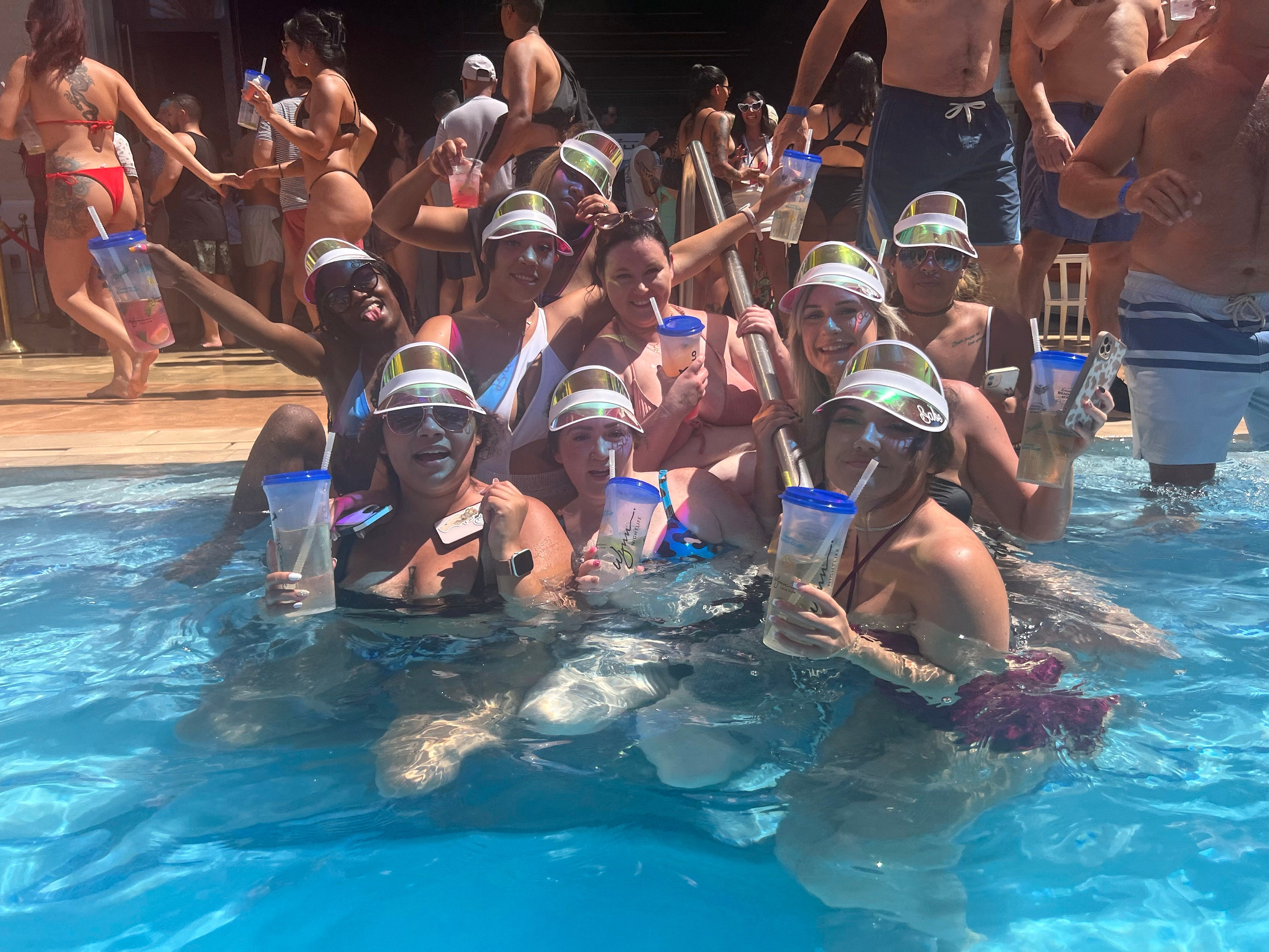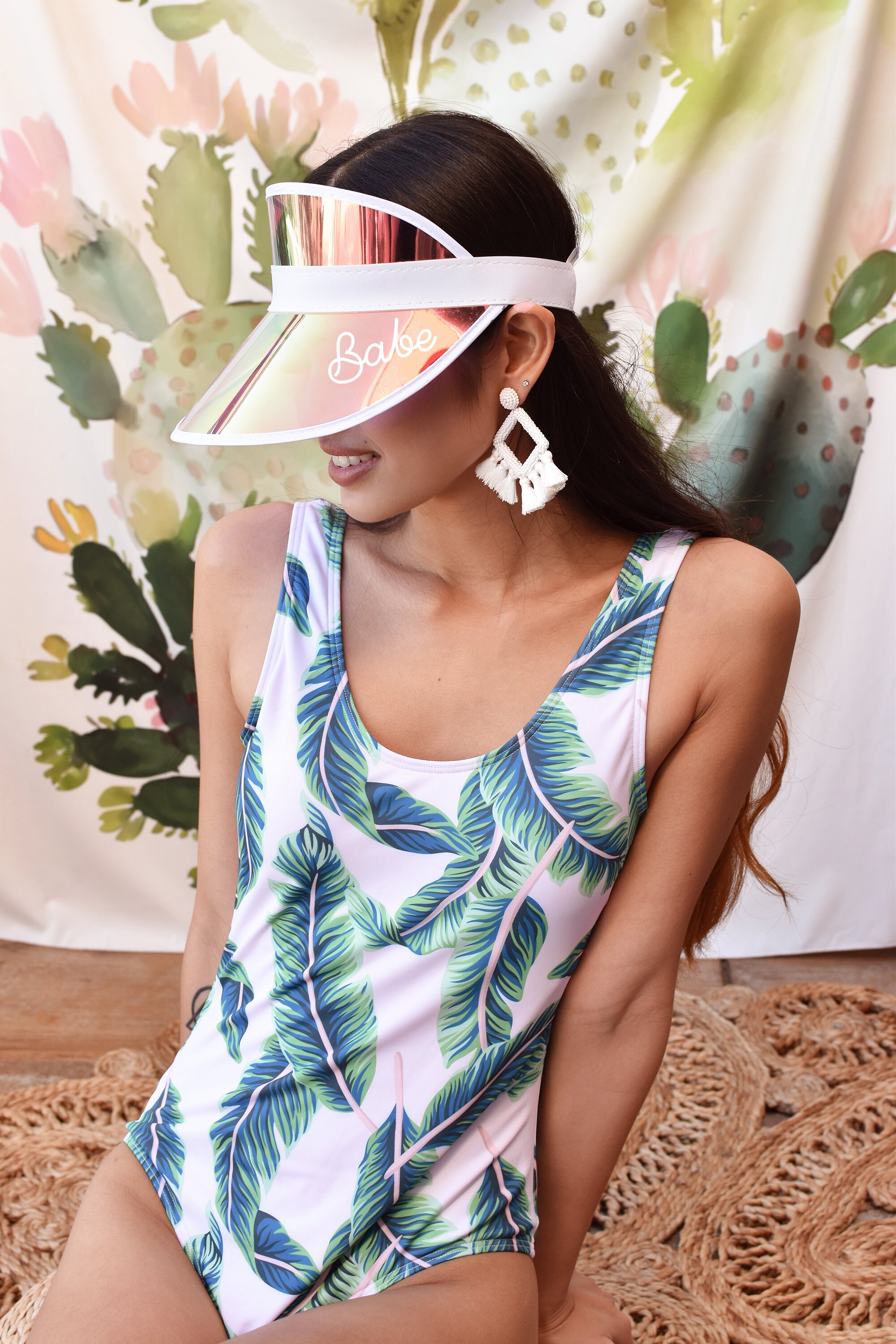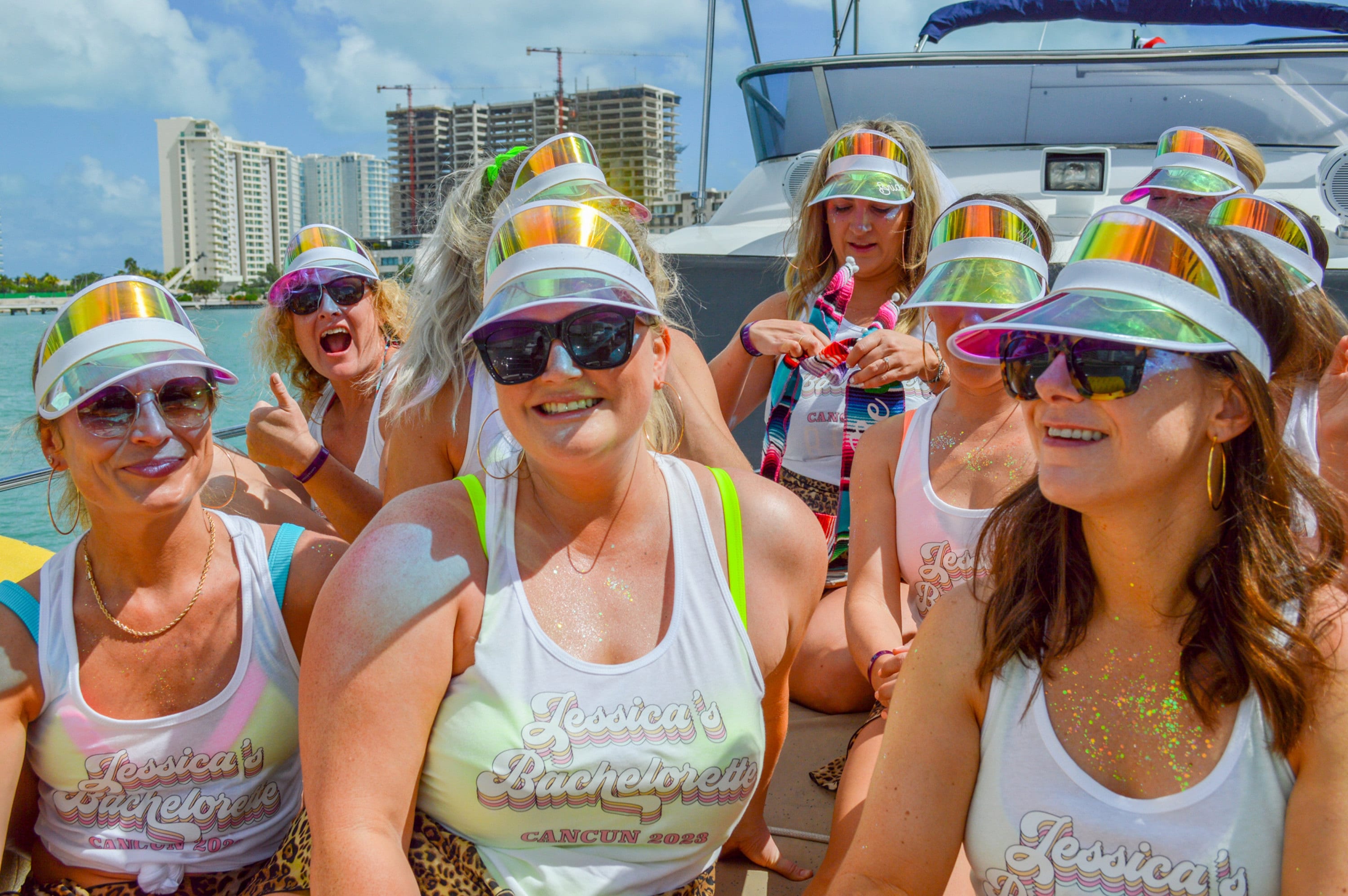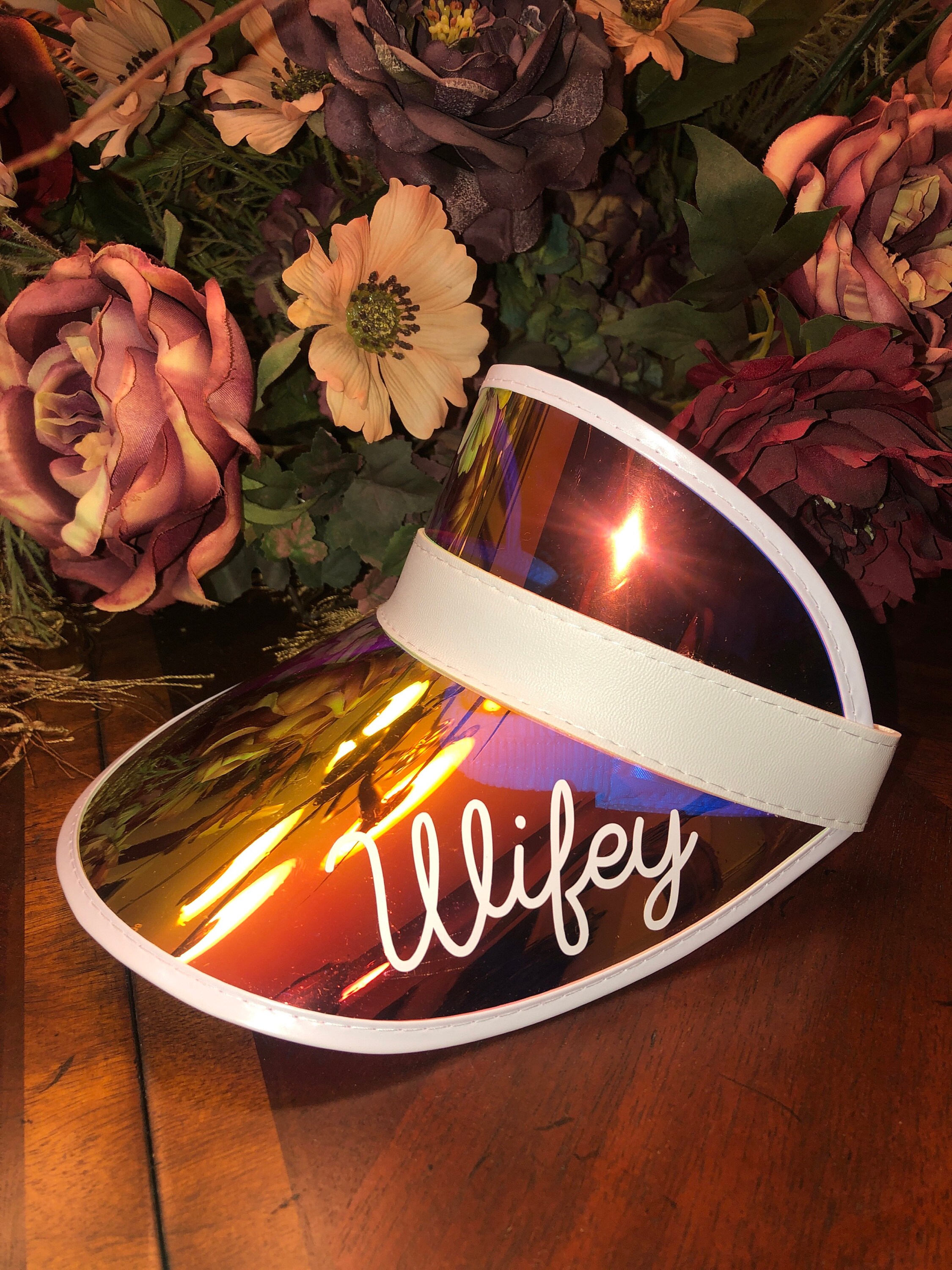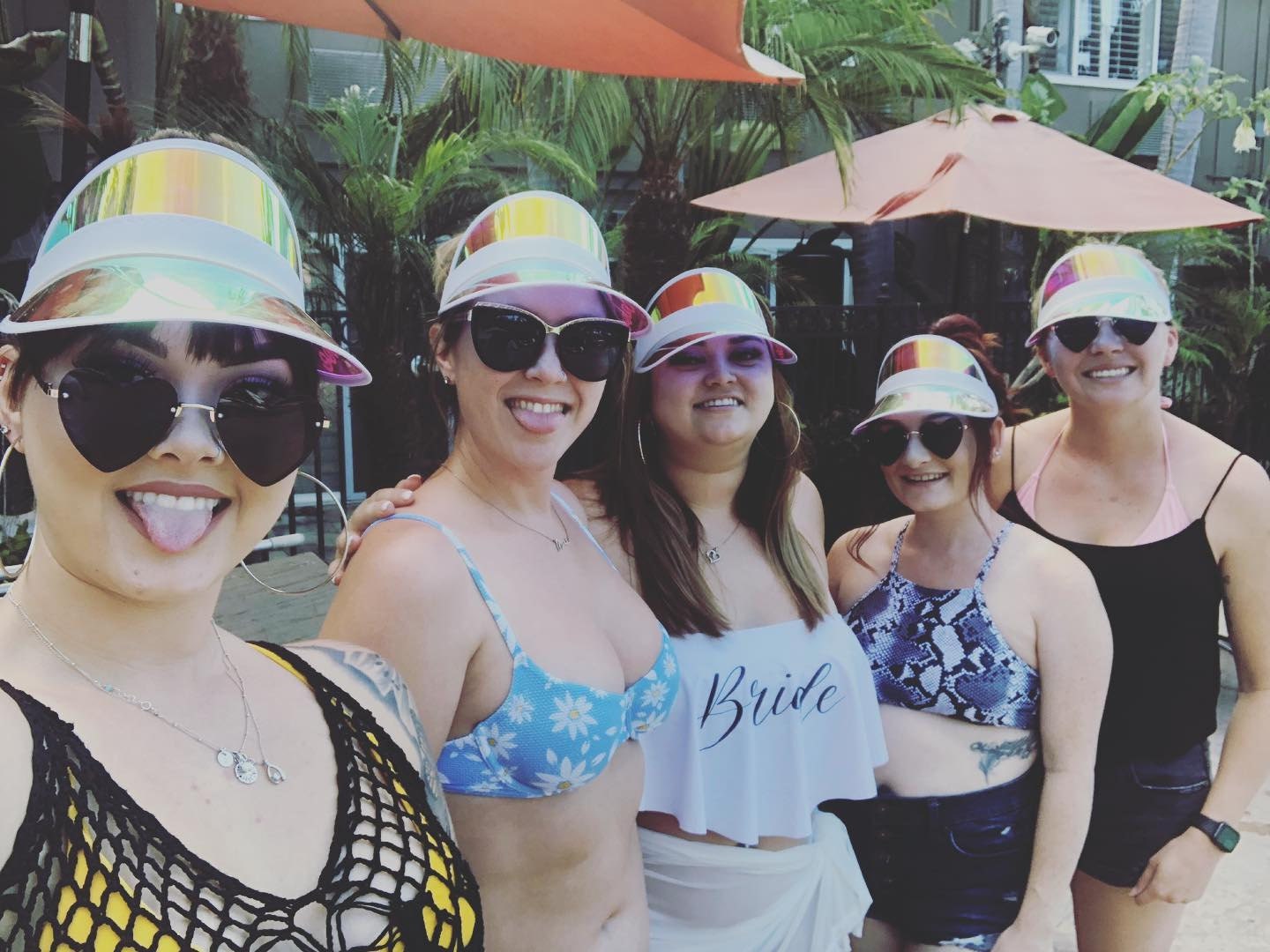 Personalized beach hats are the perfect accessory for your bachelorette party at the pool or beach! Available in white vinyl with bride, baby or custom names, each holographic hat is sure to make your wedding party stand out.