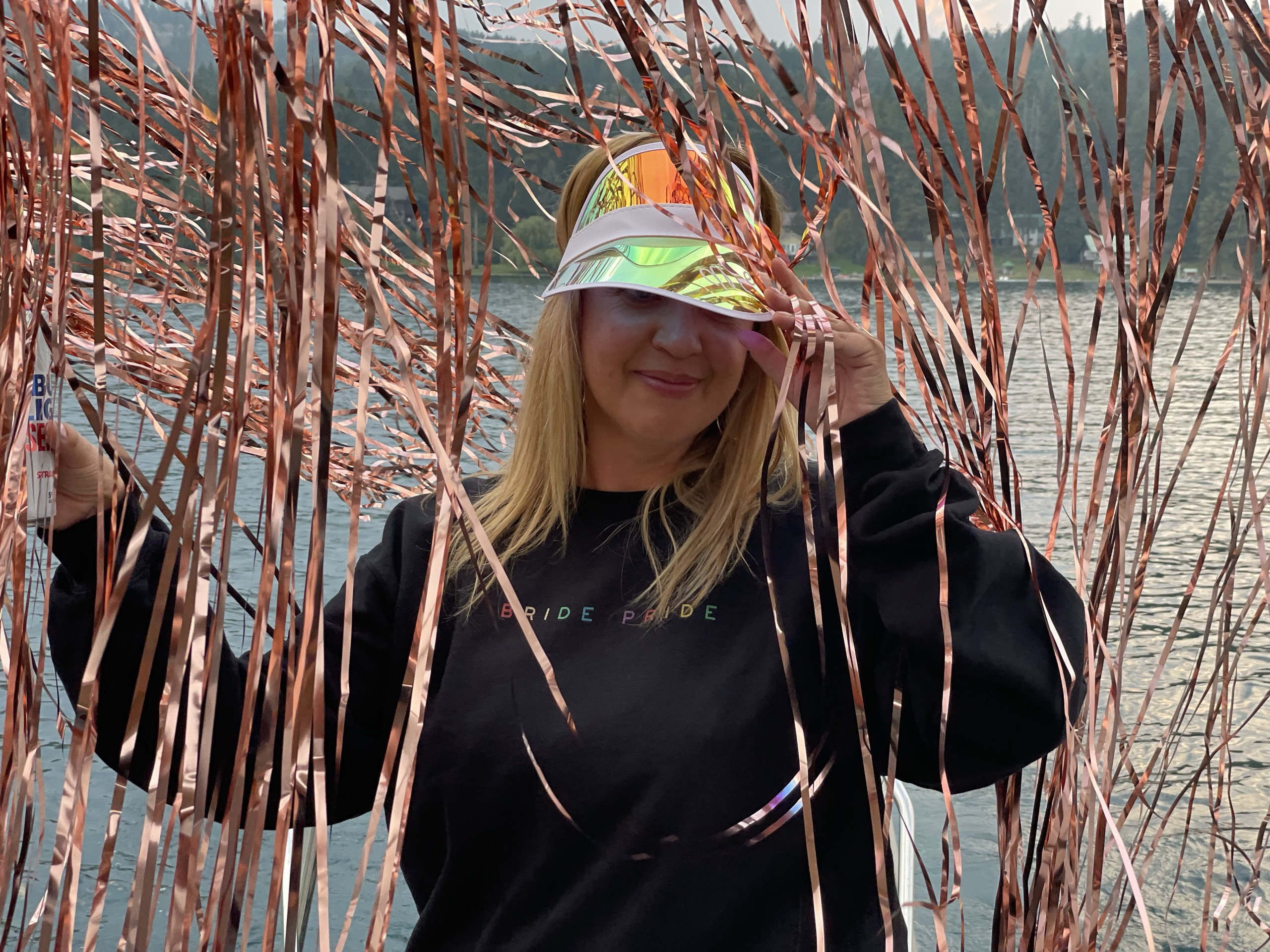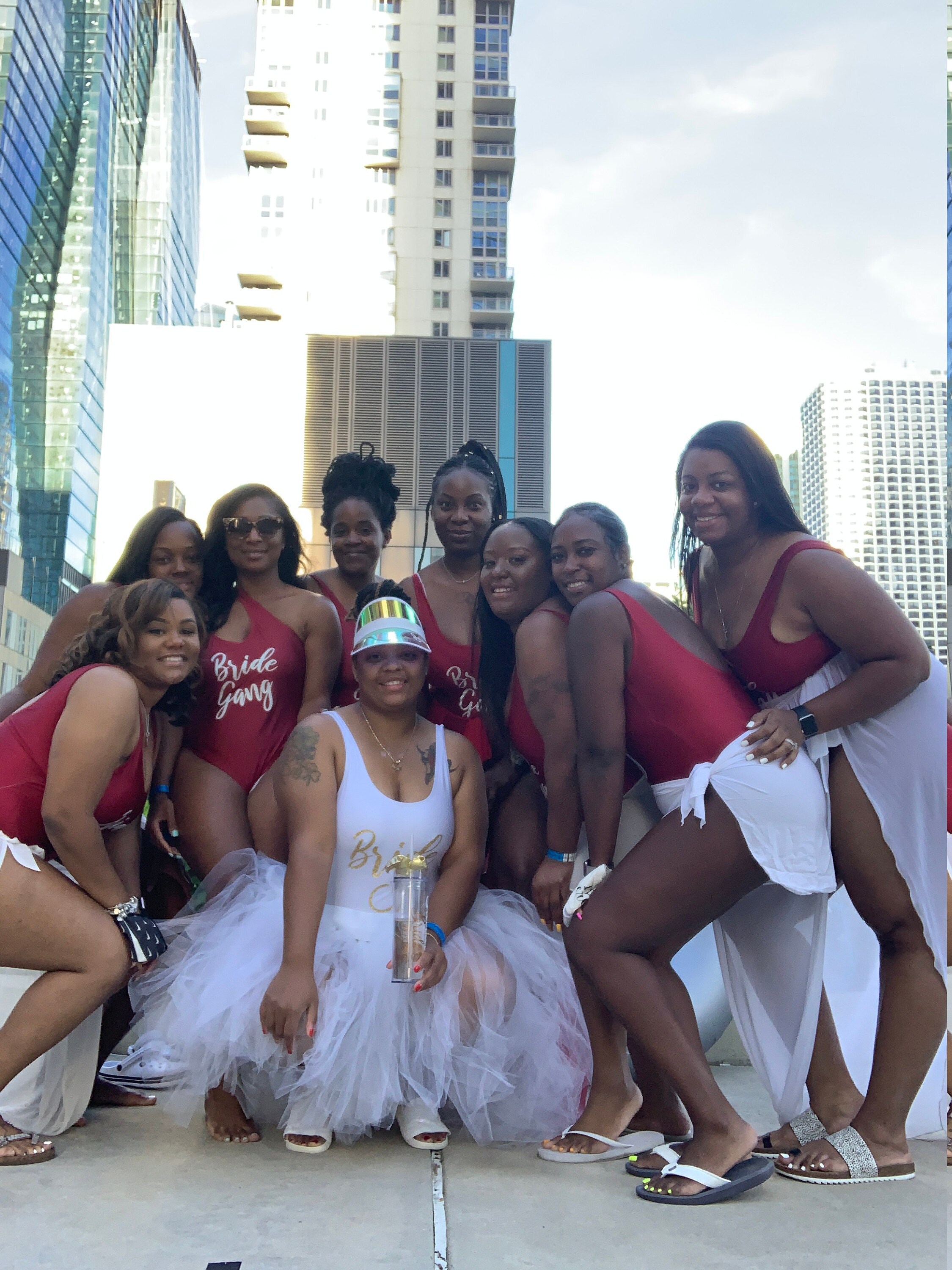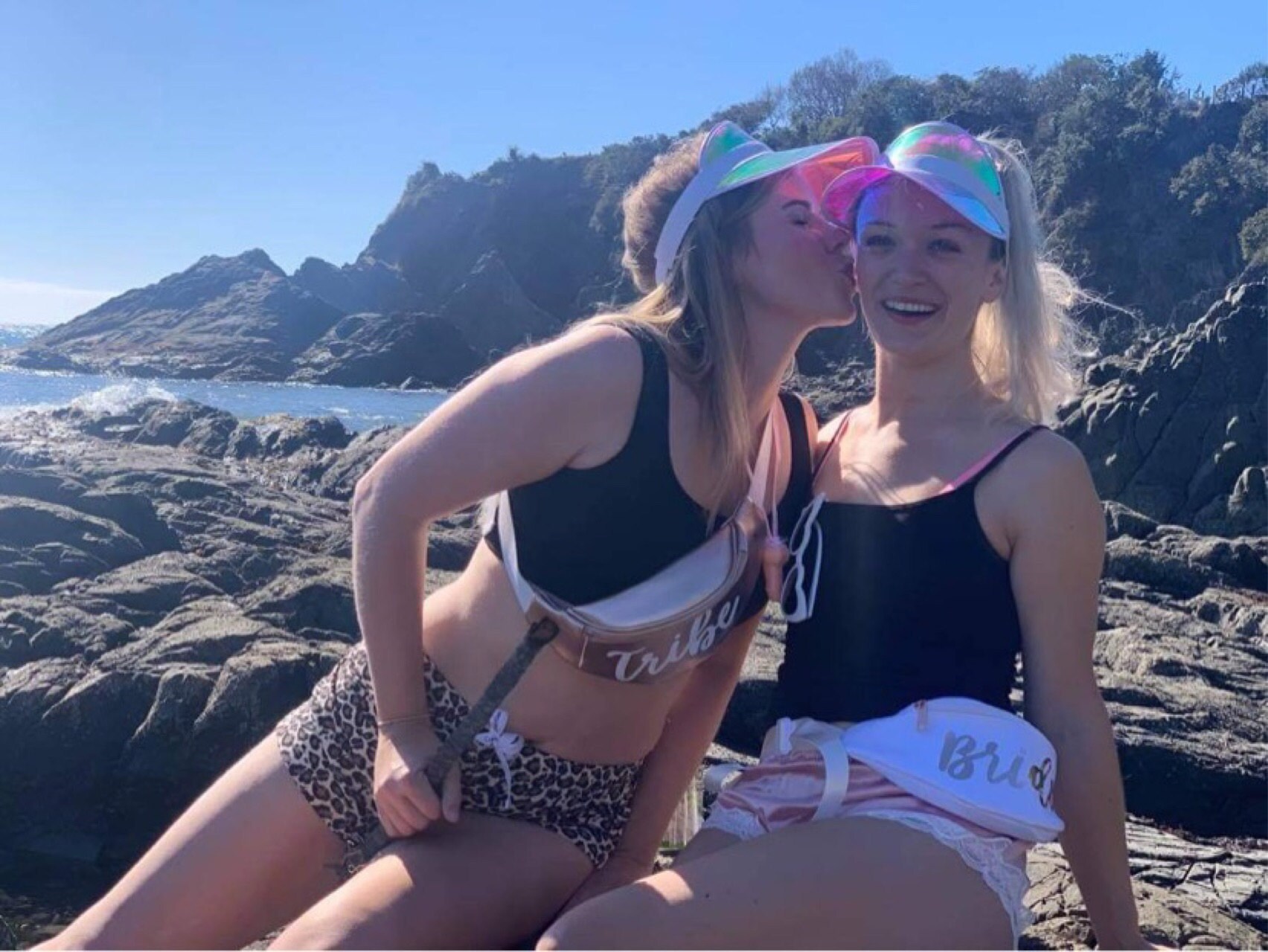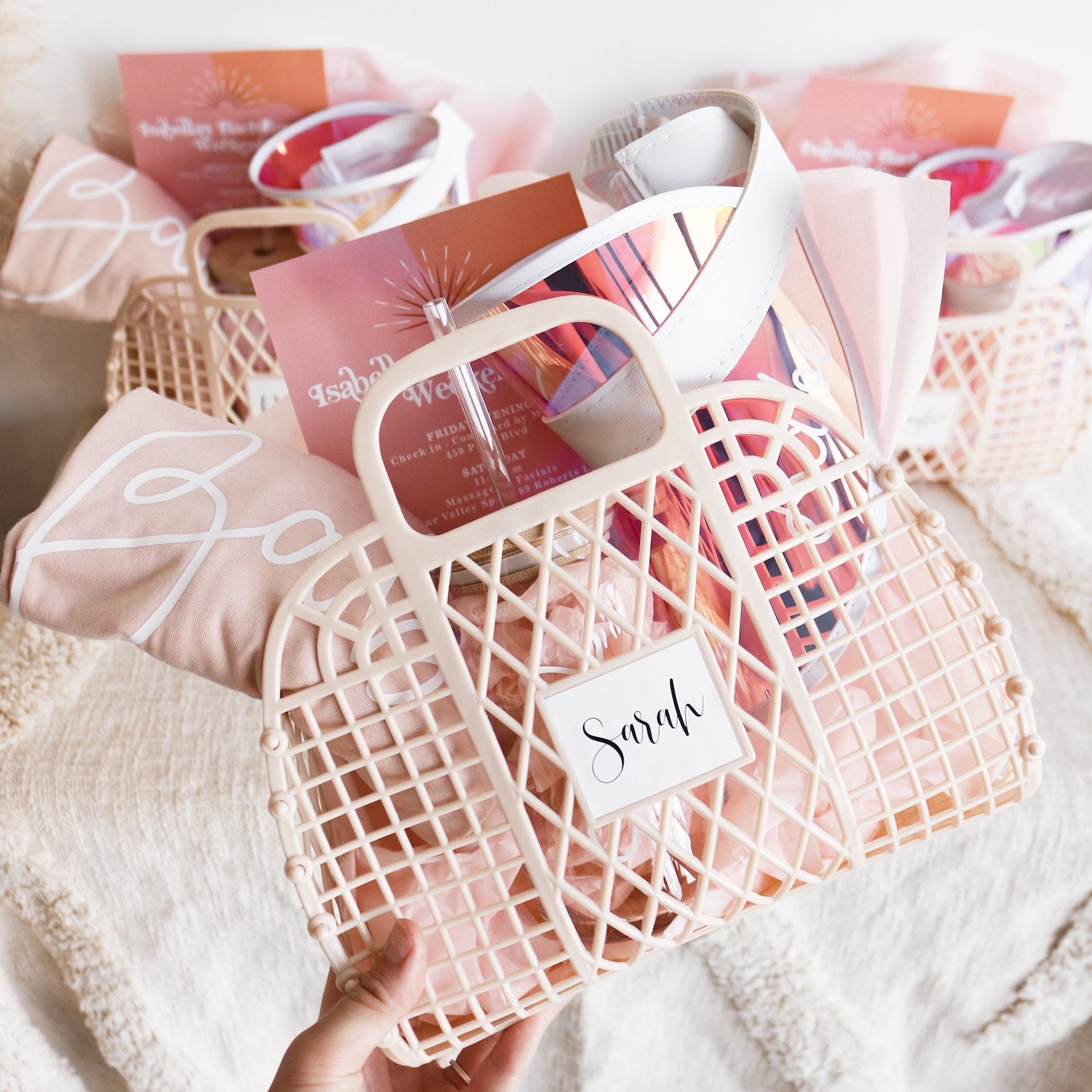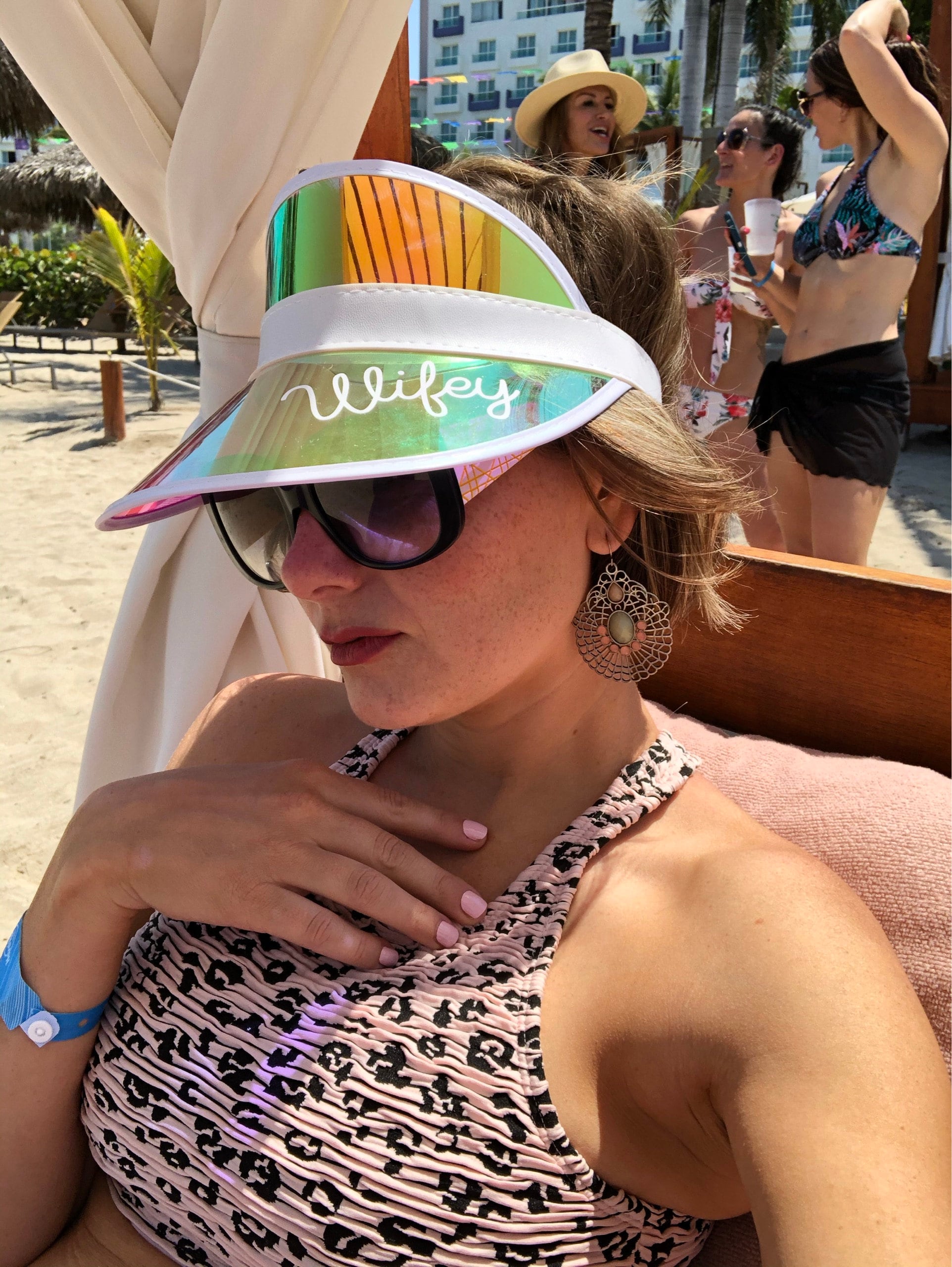 Personalized beach hats are the perfect accessory for your bachelorette party at the pool or beach! Available in white vinyl with bride, baby or custom names, each holographic hat is sure to make your wedding party stand out.