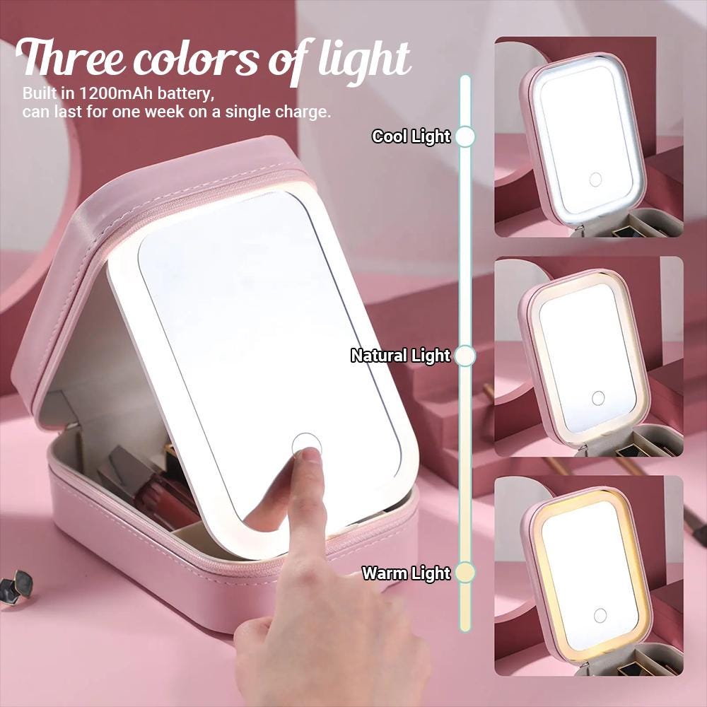 Features: Custom floral print, LED makeup mirror (3 lighting modes), USB-C charging port, jewelry/makeup compartment