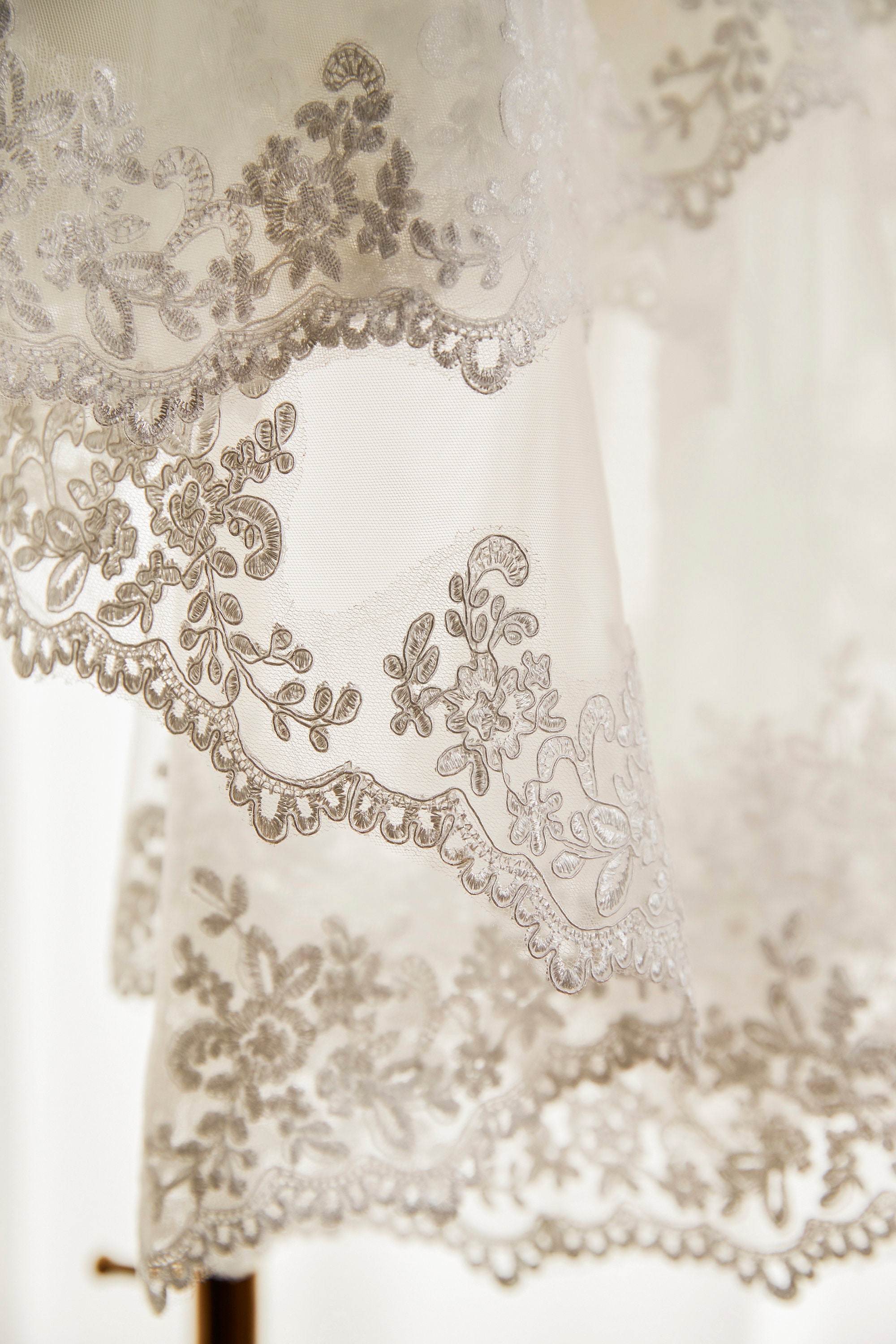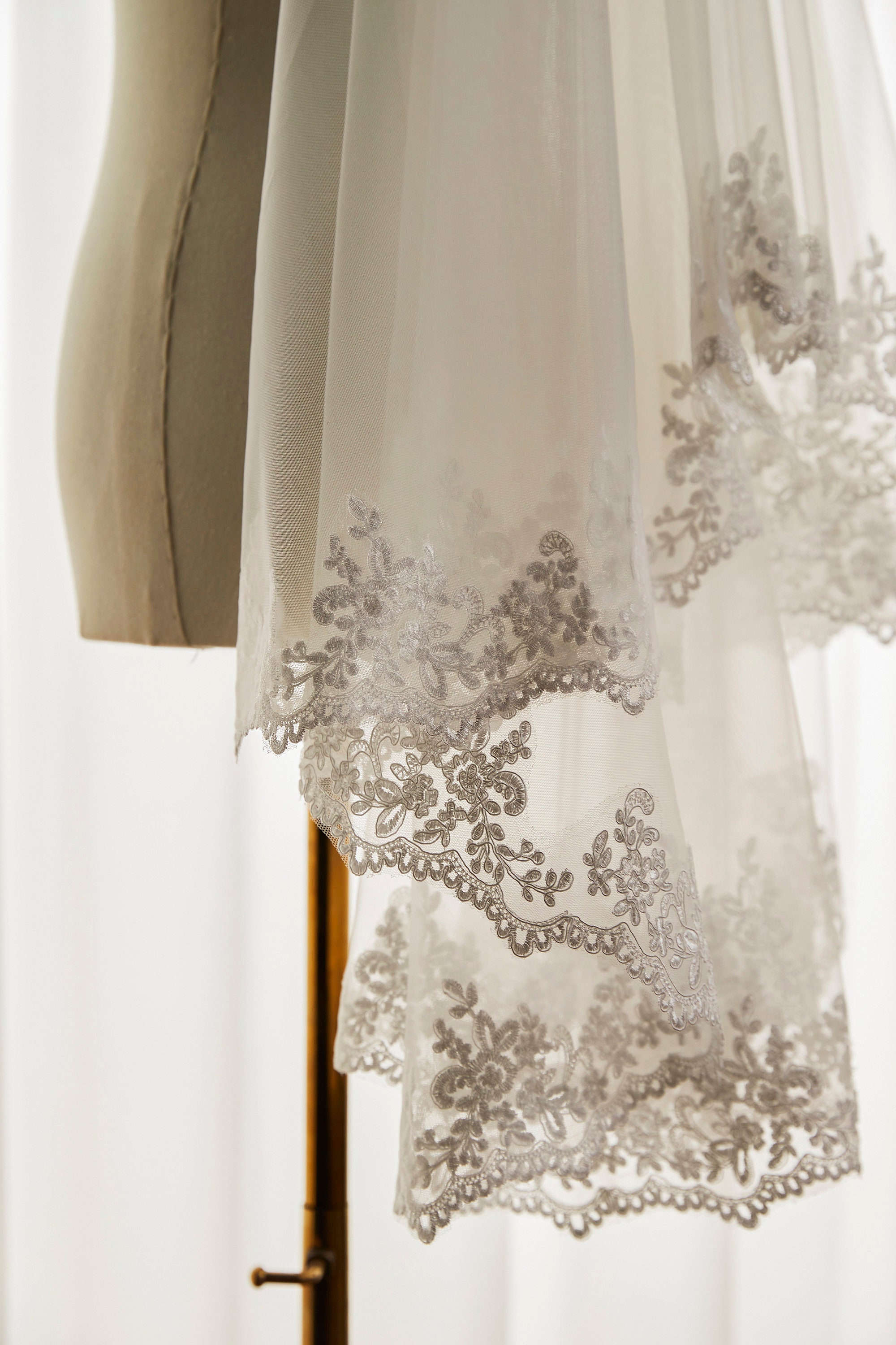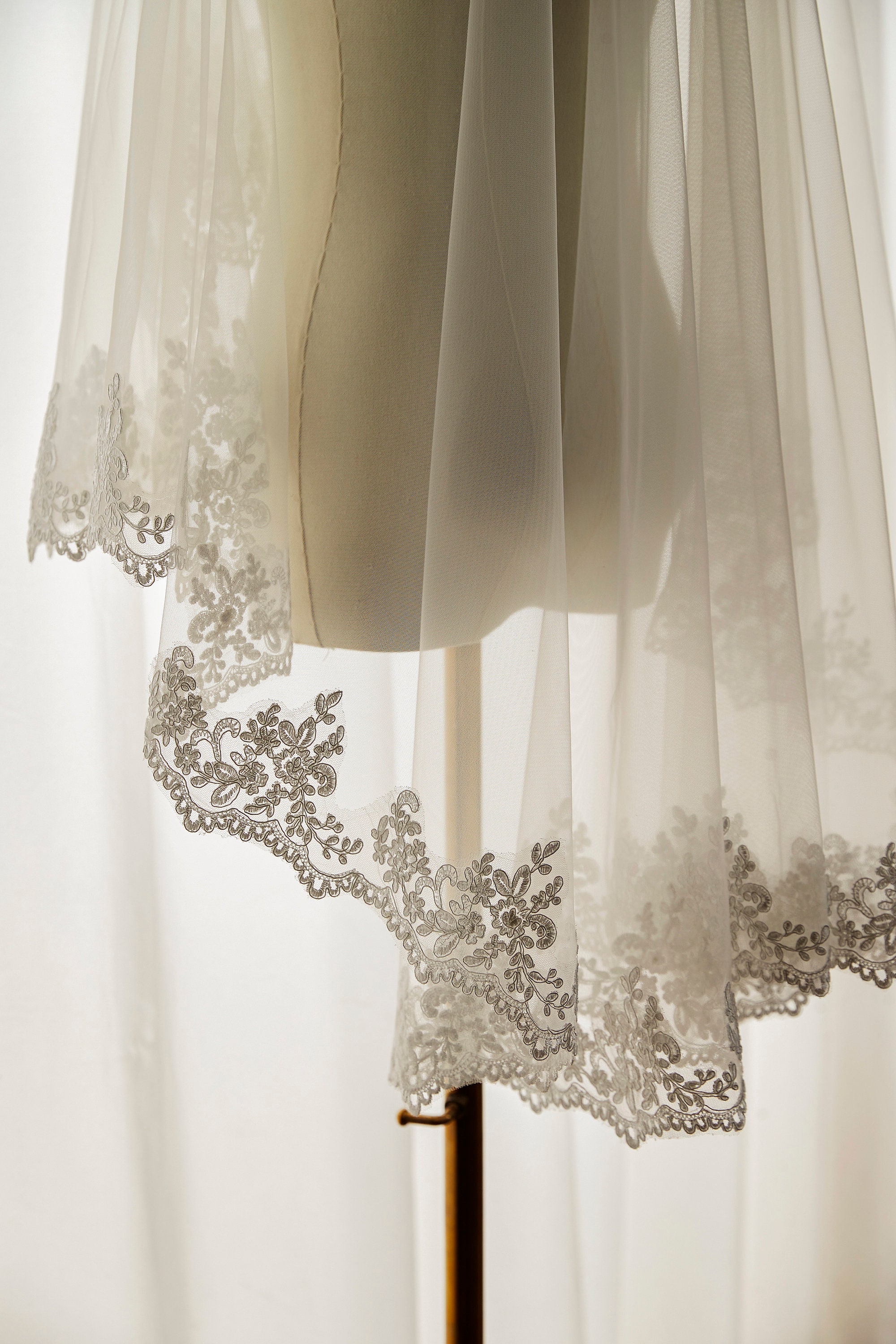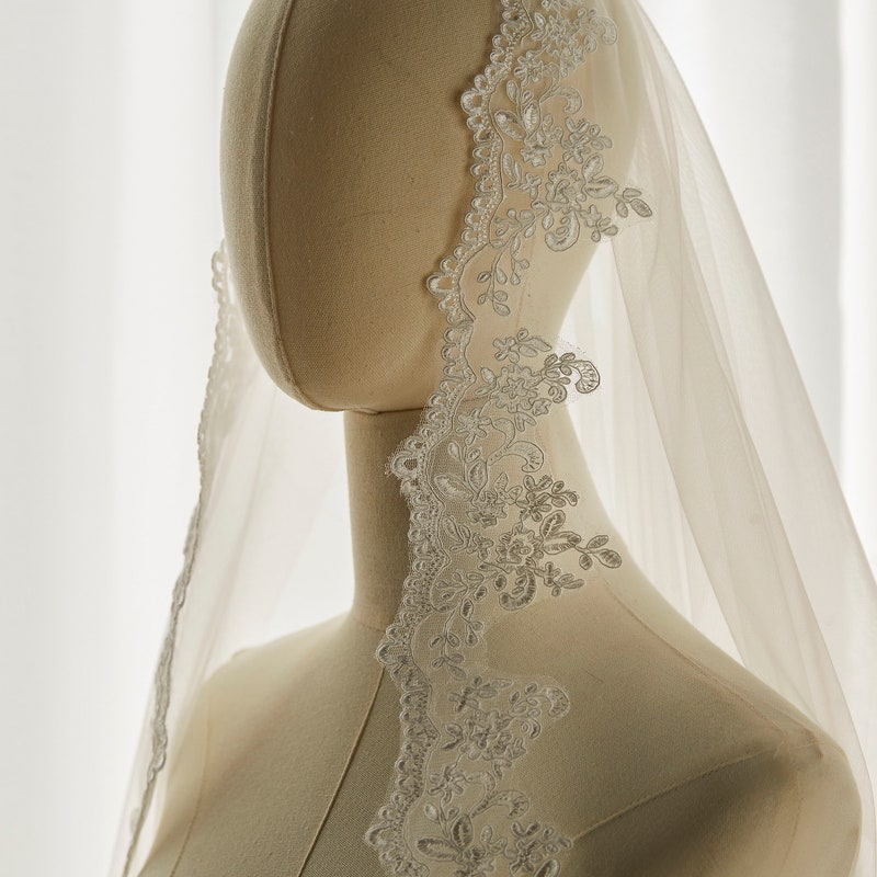 Elegant Venetian lace veil, made of scalloped Venetian lace and soft tulle, let your dress see through. The pattern is designed with delicate scalloped floral and leaf lace edges.