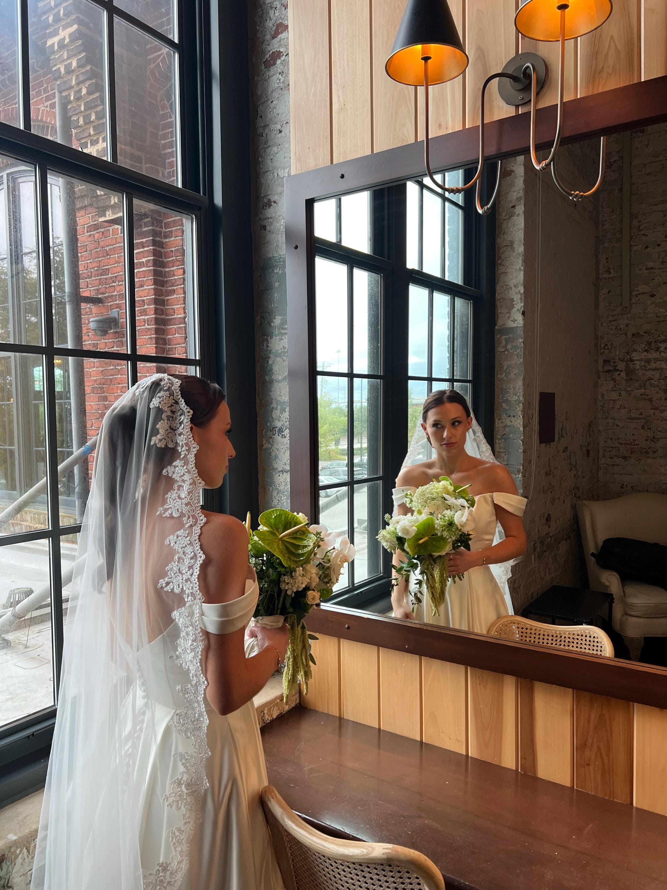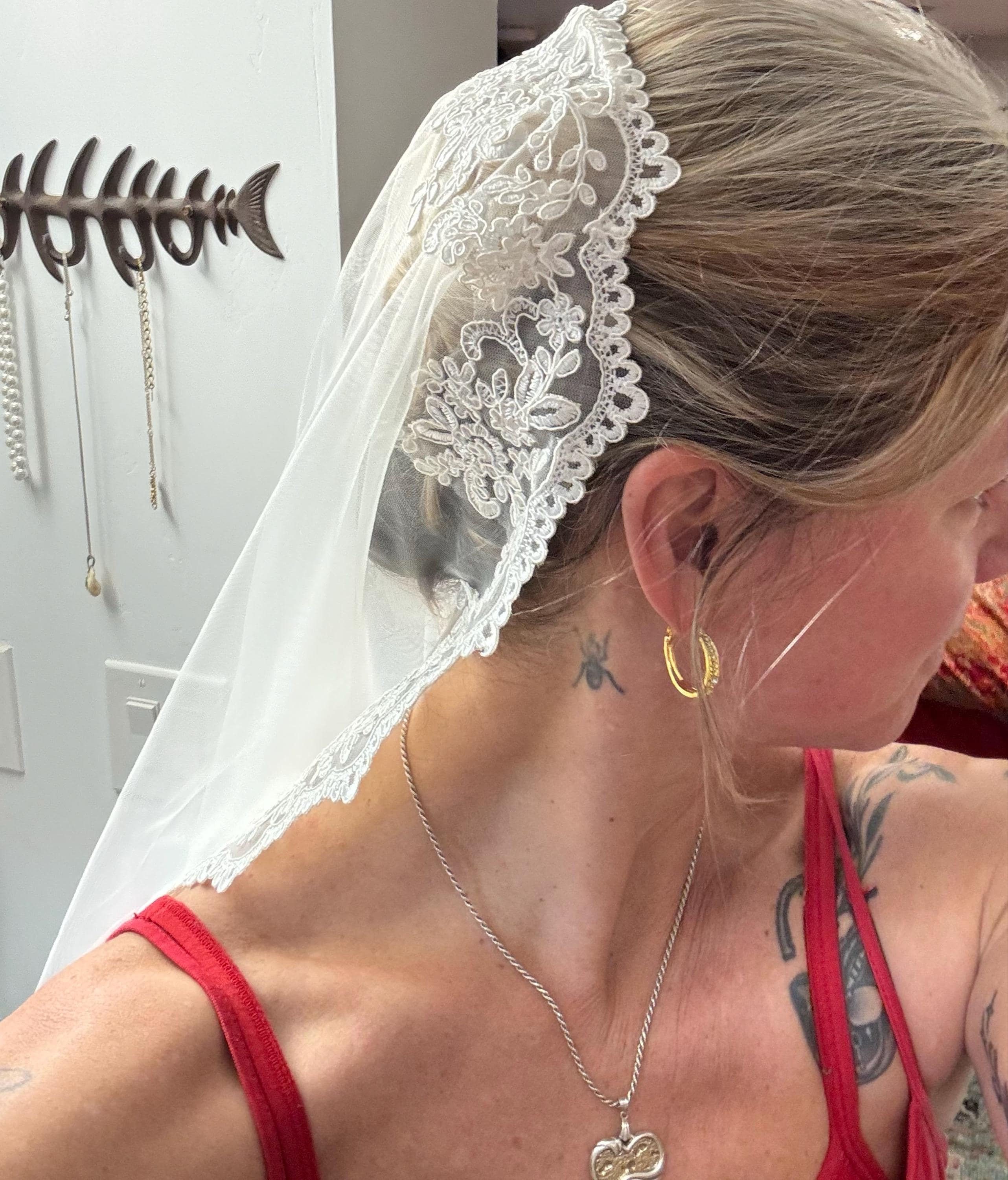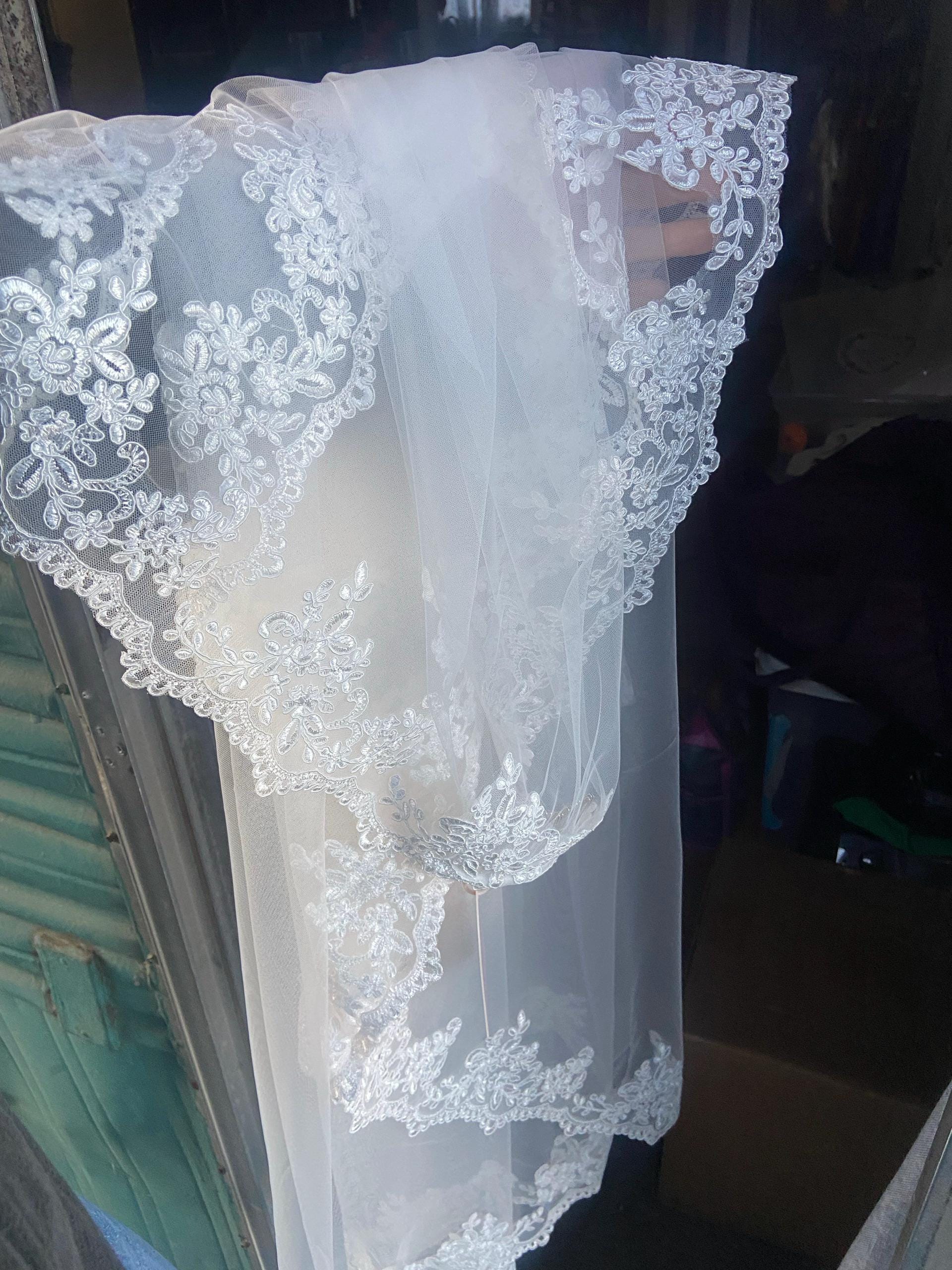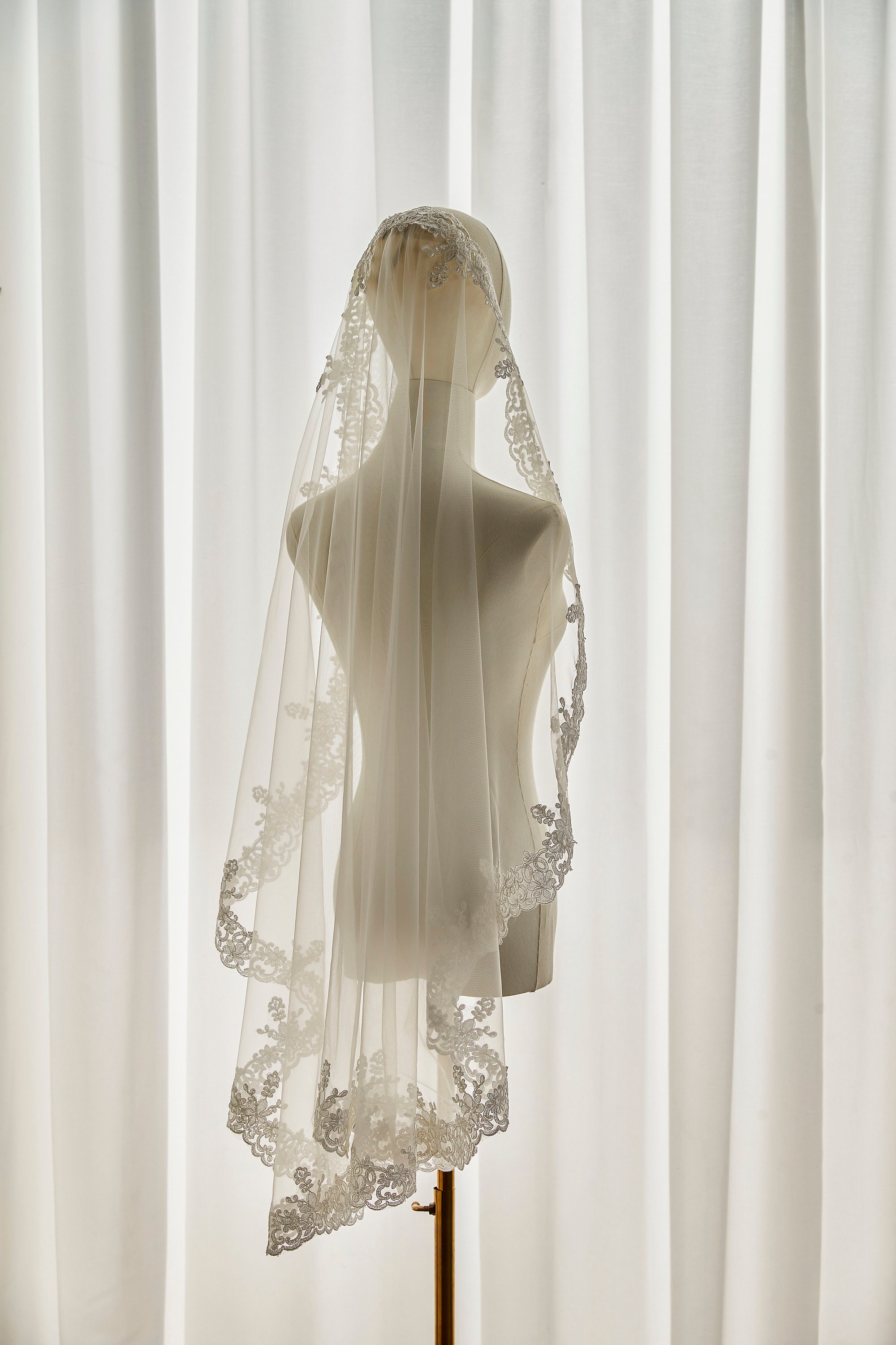 Elegant Venetian lace veil, made of scalloped Venetian lace and soft tulle, let your dress see through. The pattern is designed with delicate scalloped floral and leaf lace edges.