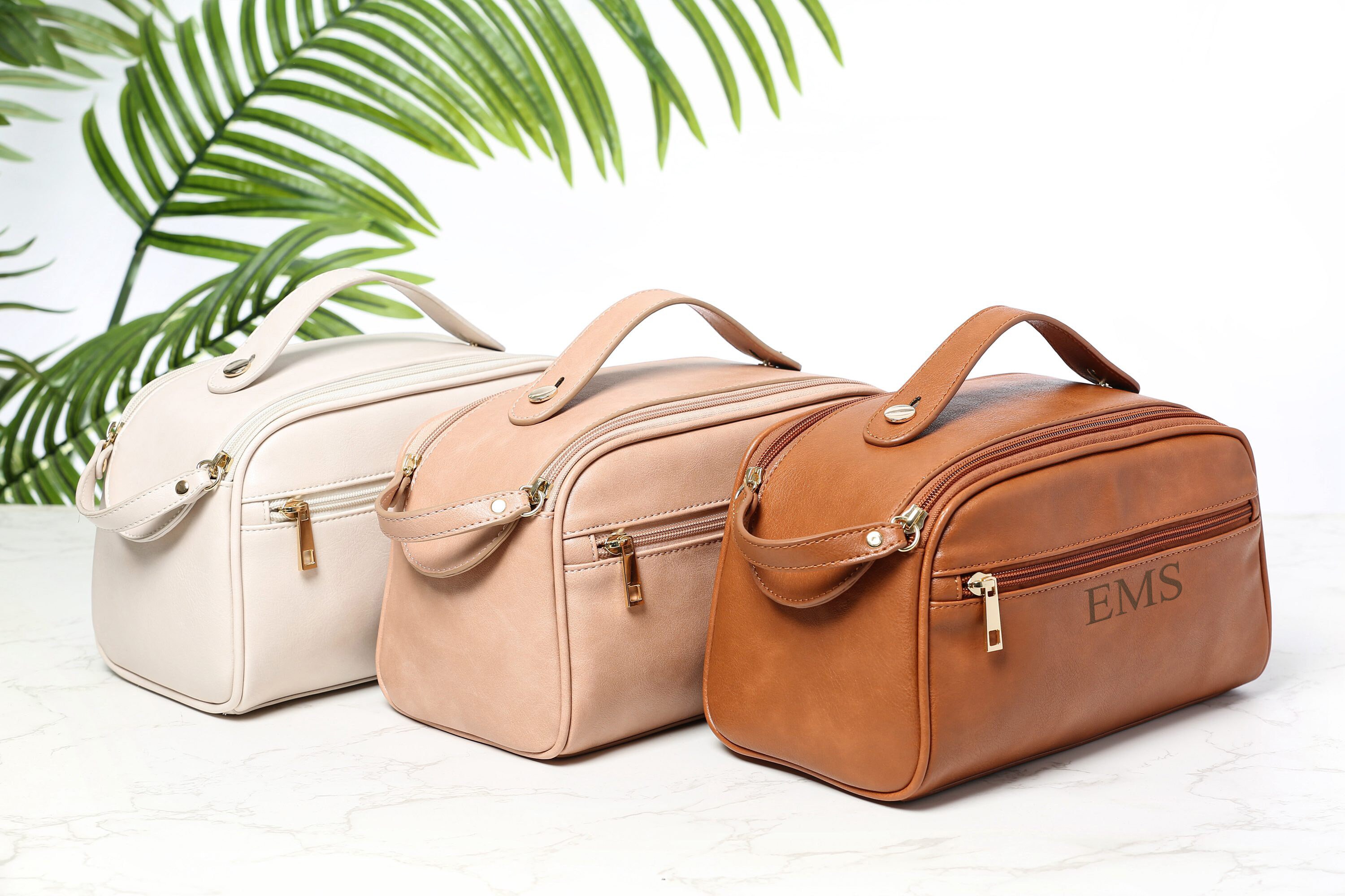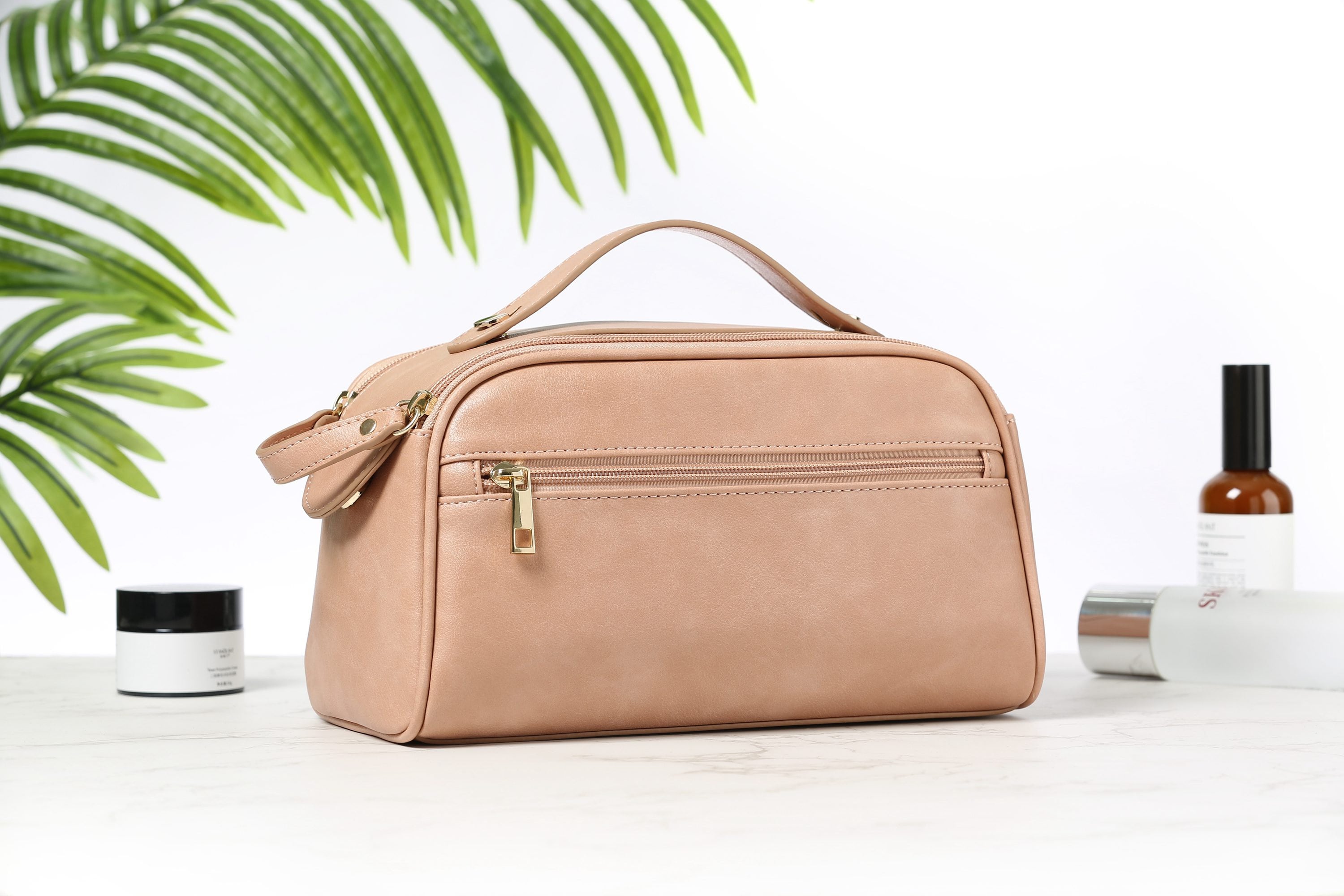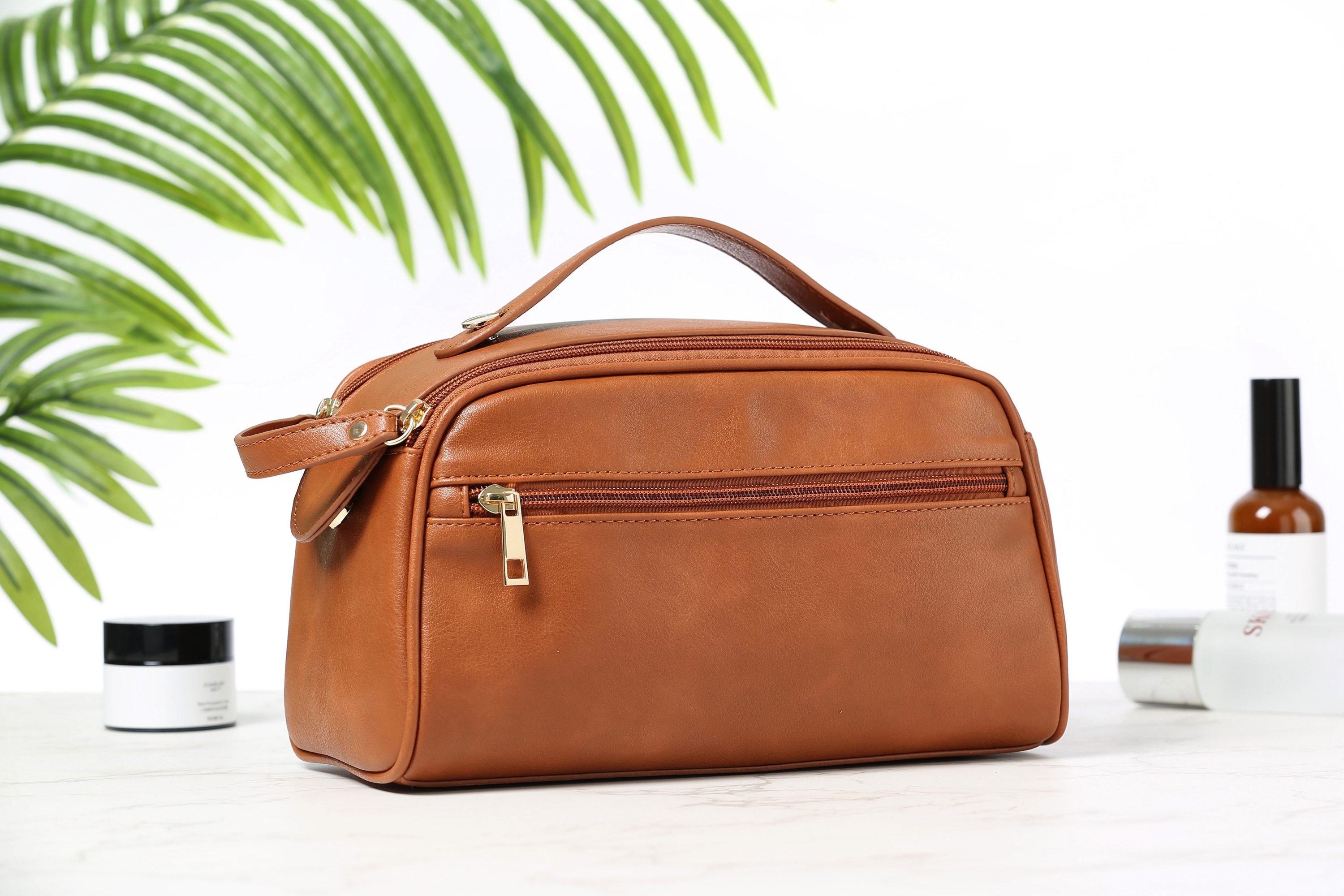 We made this elegant toiletry bag with high-quality vegan leather, industrial strength gold hardware, and waterproof lining. This toiletry bag is large enough to hold all your toiletries and toiletries essentials and keep everything in order in an organized manner. It has 3 elastic pockets for bottles, tubes, razors, etc. This bag features a very convenient double zipper with a leather handle making it very easy to carry.