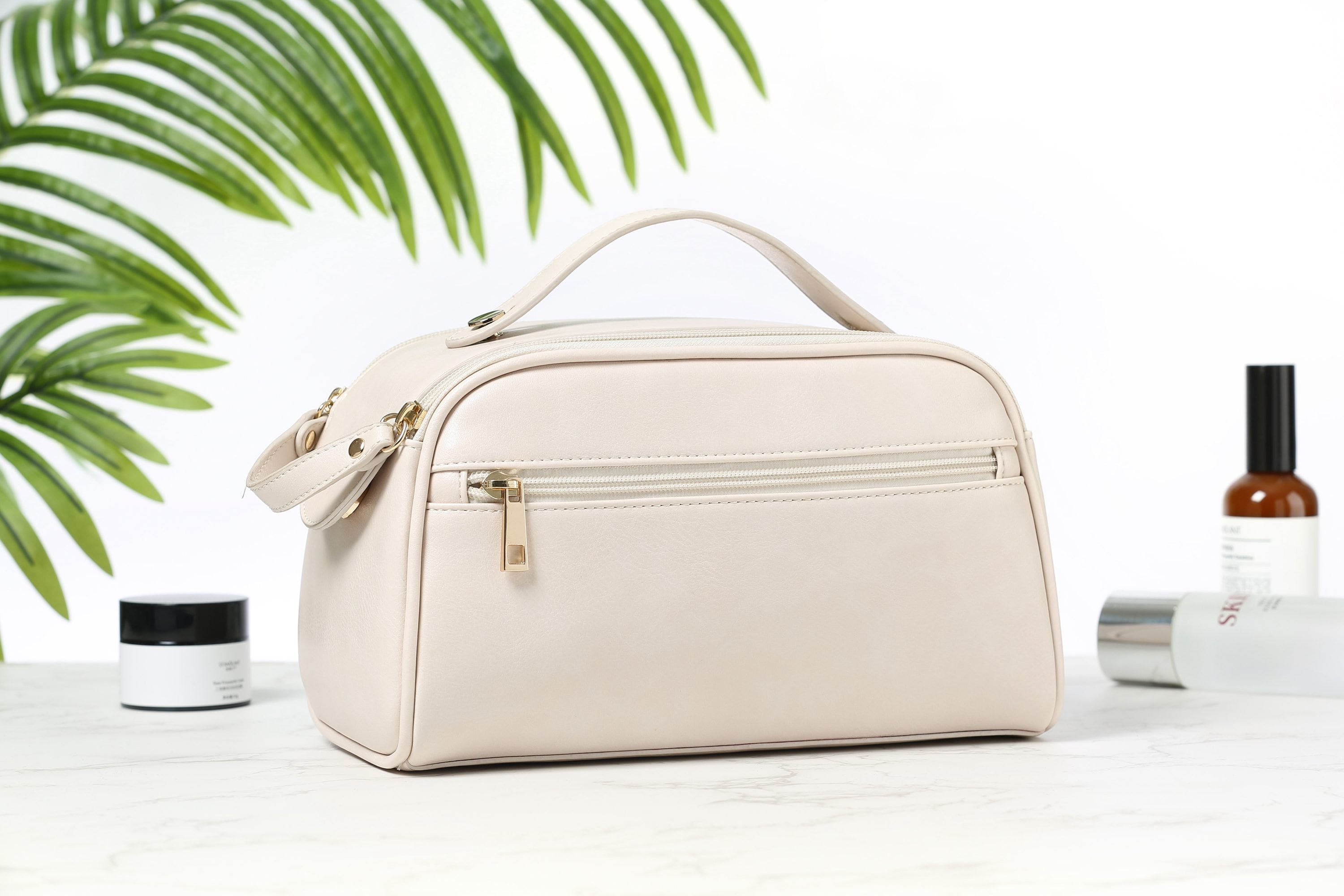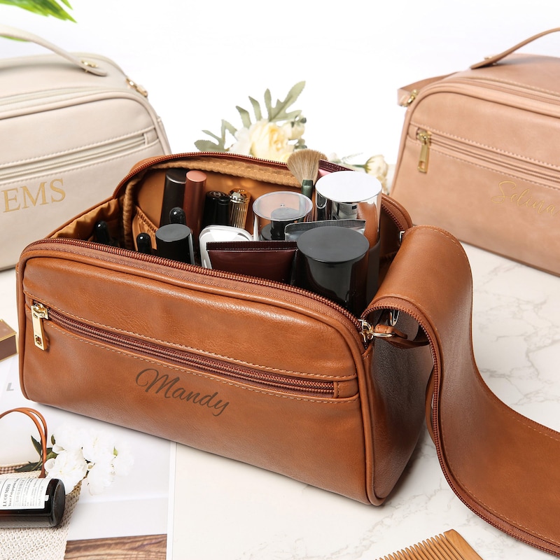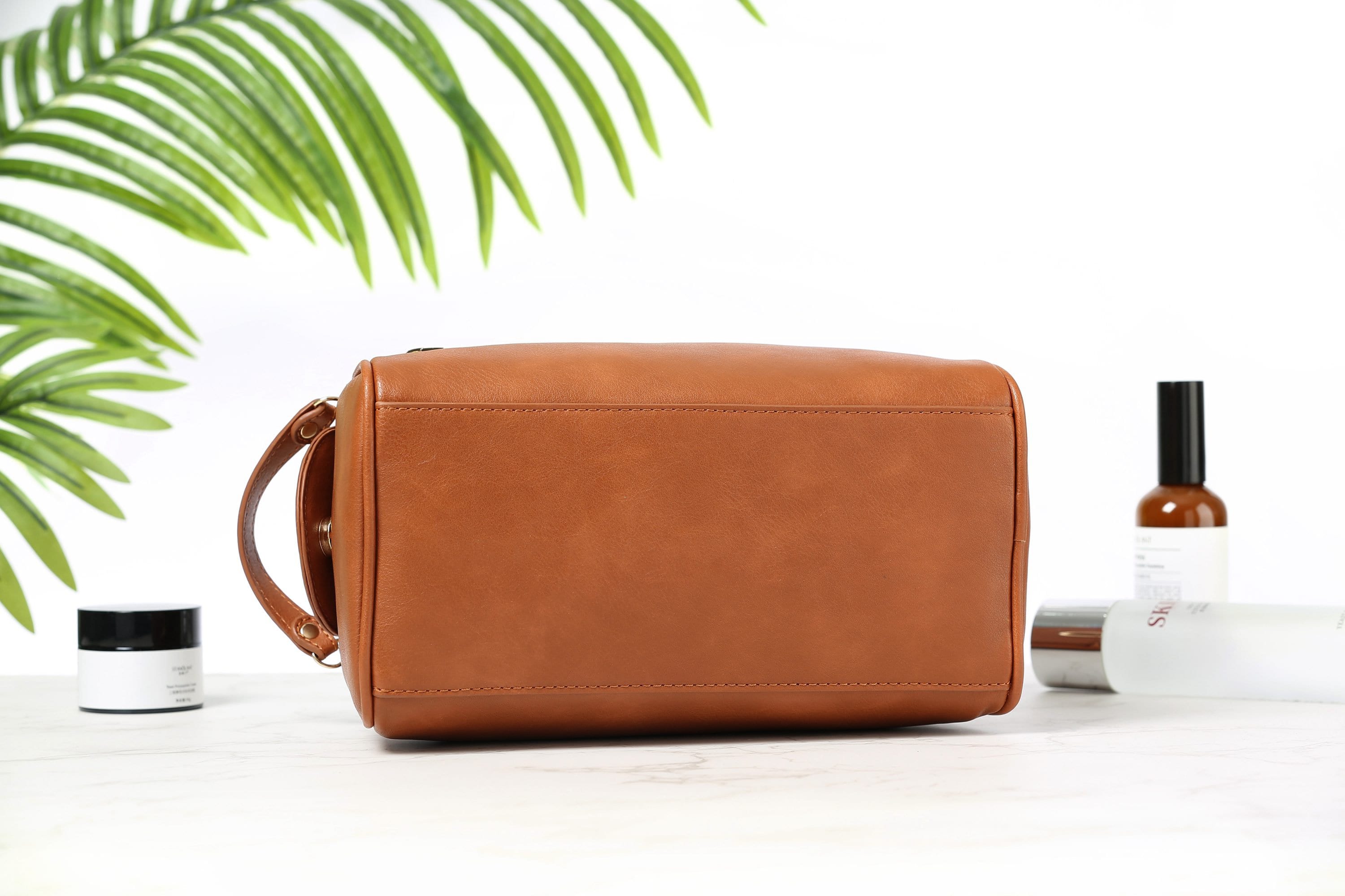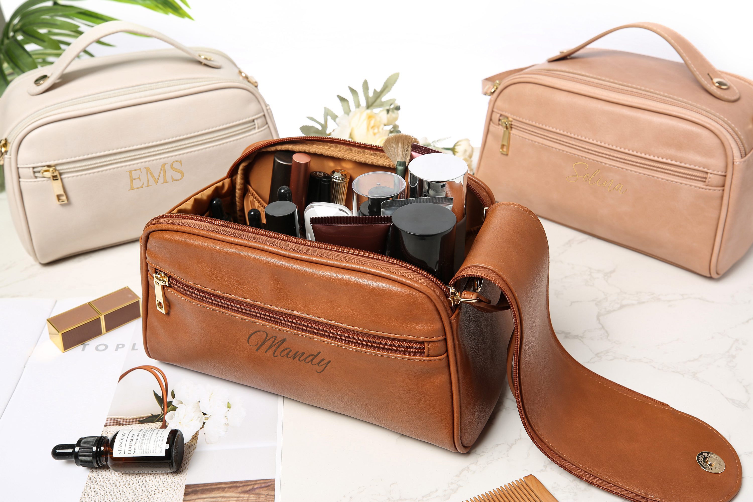 We made this elegant toiletry bag with high-quality vegan leather, industrial strength gold hardware, and waterproof lining. This toiletry bag is large enough to hold all your toiletries and toiletries essentials and keep everything in order in an organized manner. It has 3 elastic pockets for bottles, tubes, razors, etc. This bag features a very convenient double zipper with a leather handle making it very easy to carry.
