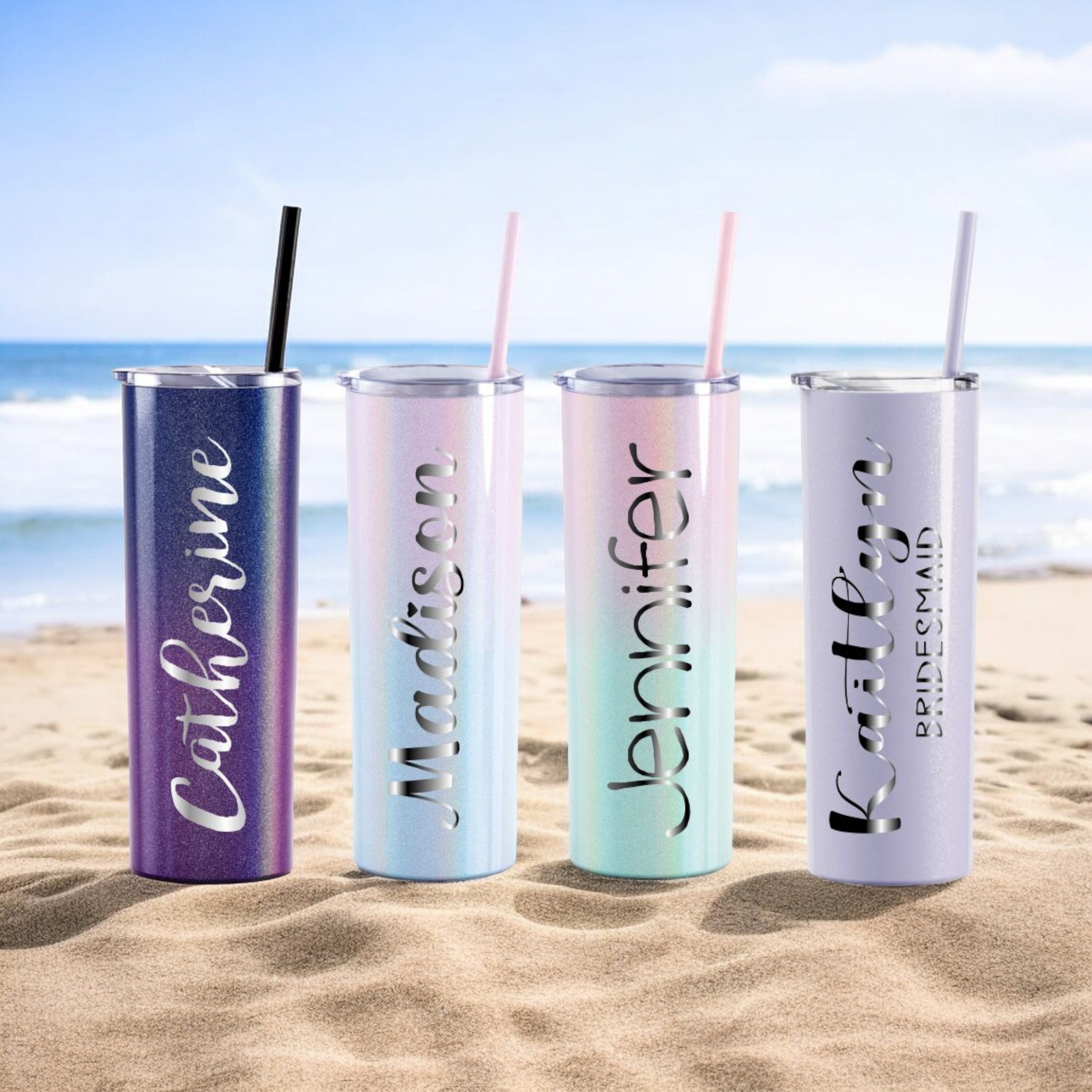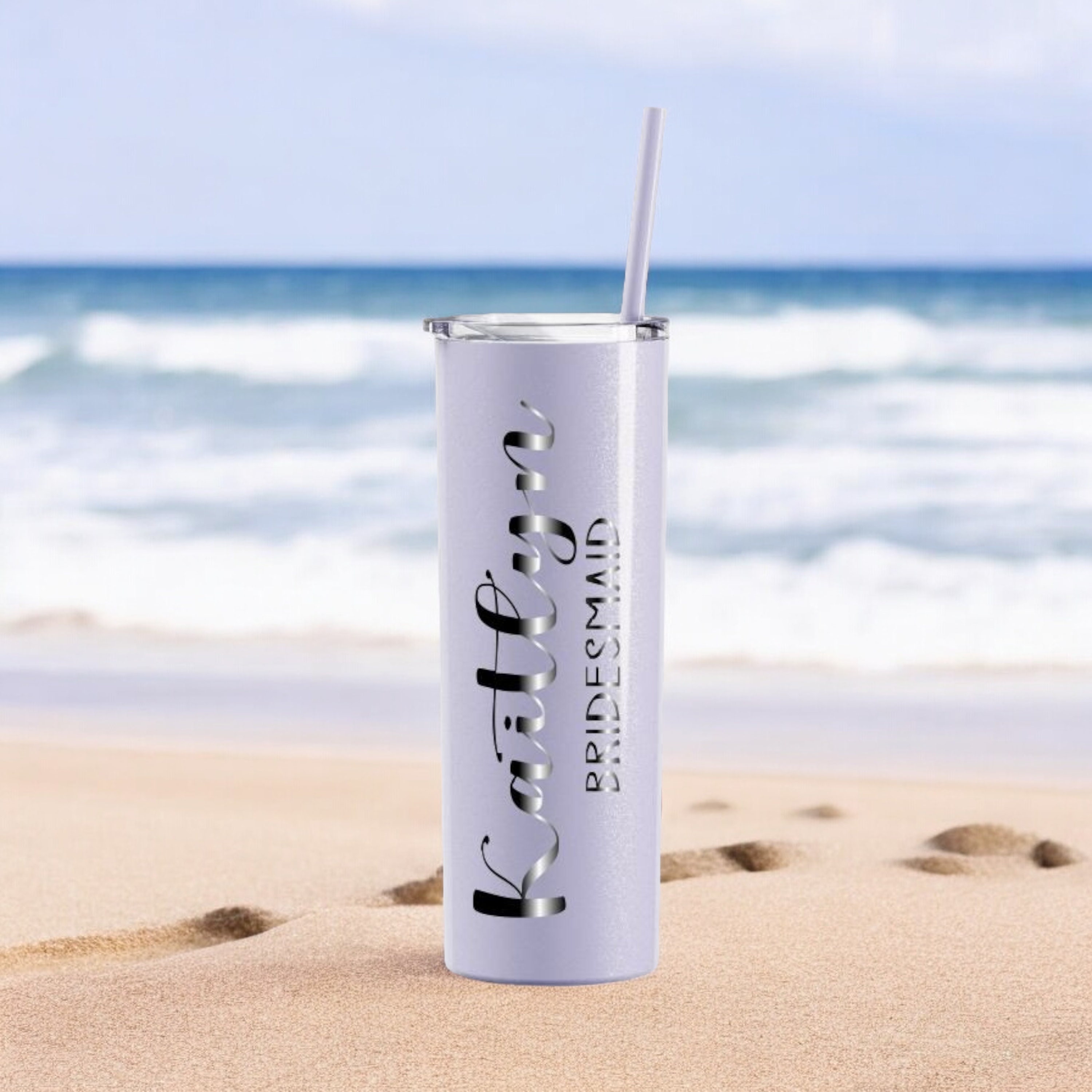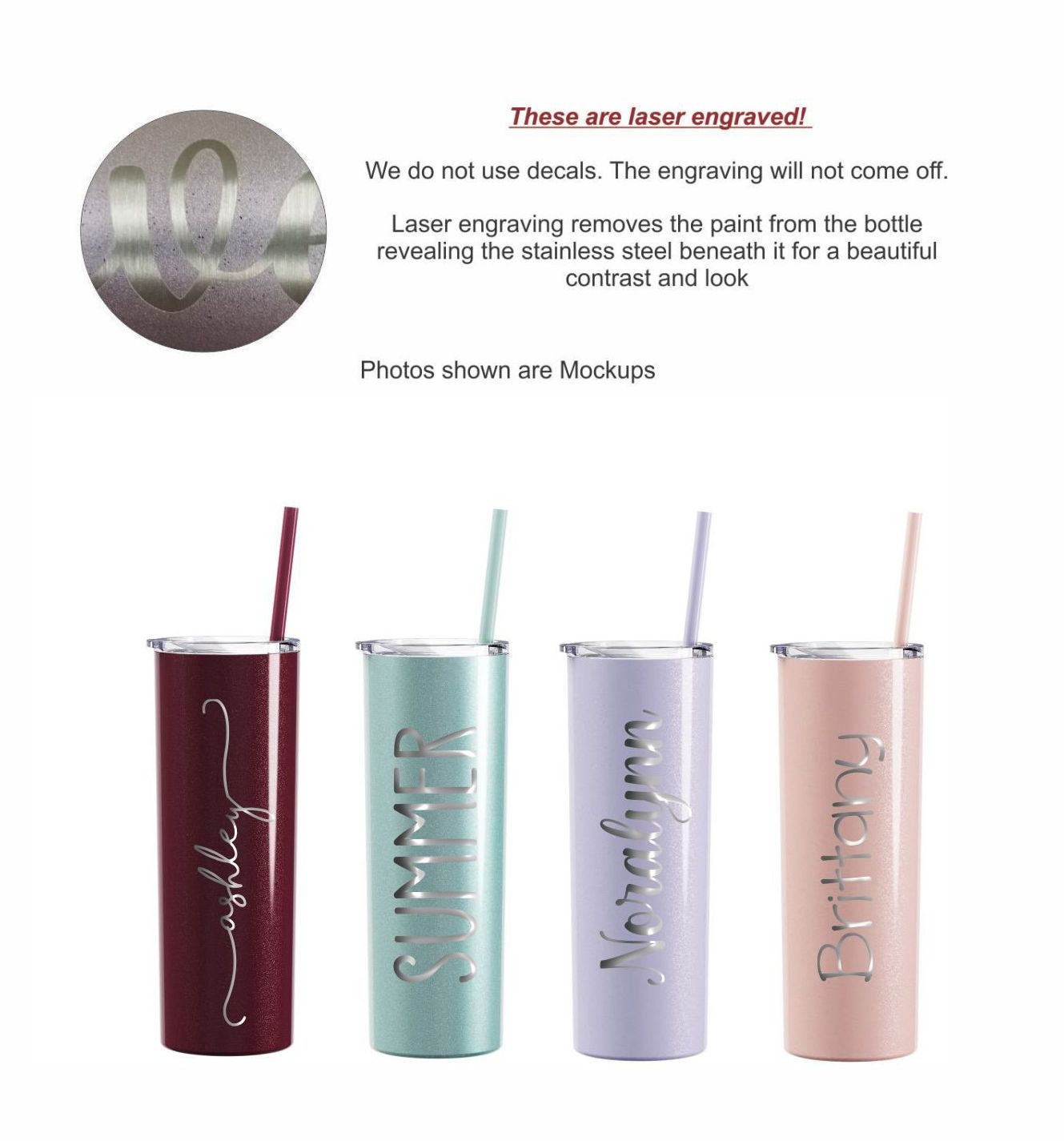 Make your bridesmaids, girls' trip, or friends' birthday extra special with our personalized stainless steel skinny tumblers! Available in multiple colors, you can choose the perfect shade to match your theme or the recipient's favorite color. Add a personal touch with a name and font of your choice, making each tumbler a unique and cherished gift. For additional engraving on the back side, feel free to contact us directly for more details.
