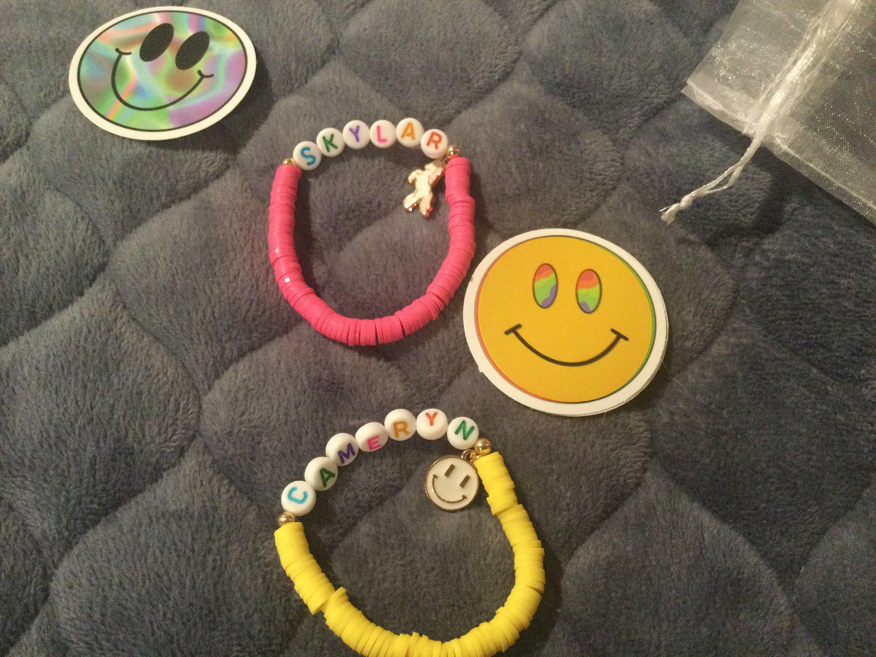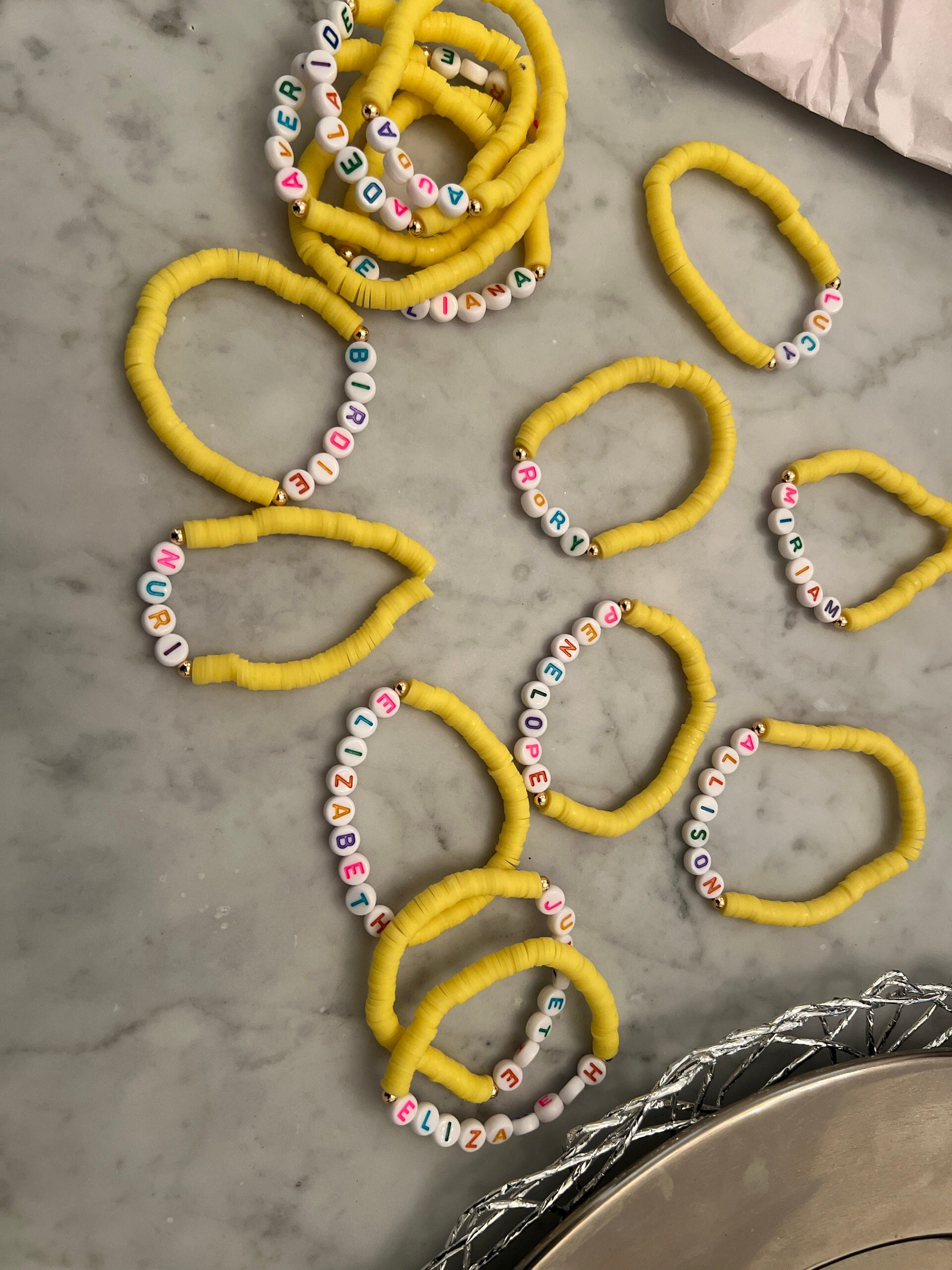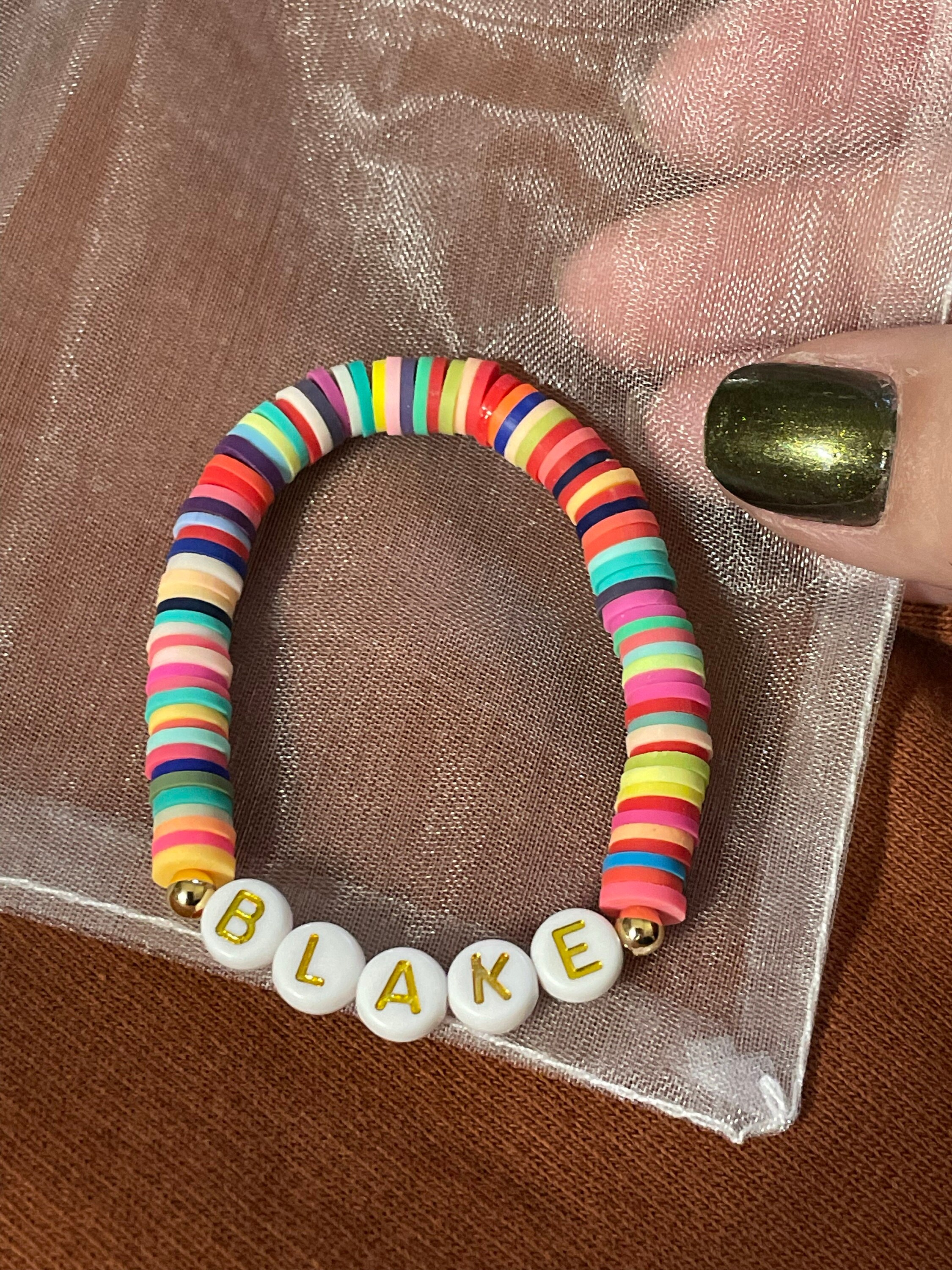 - Use “personalization” box at checkout to list your name/phrase for bracelets