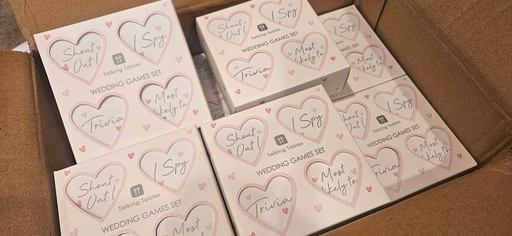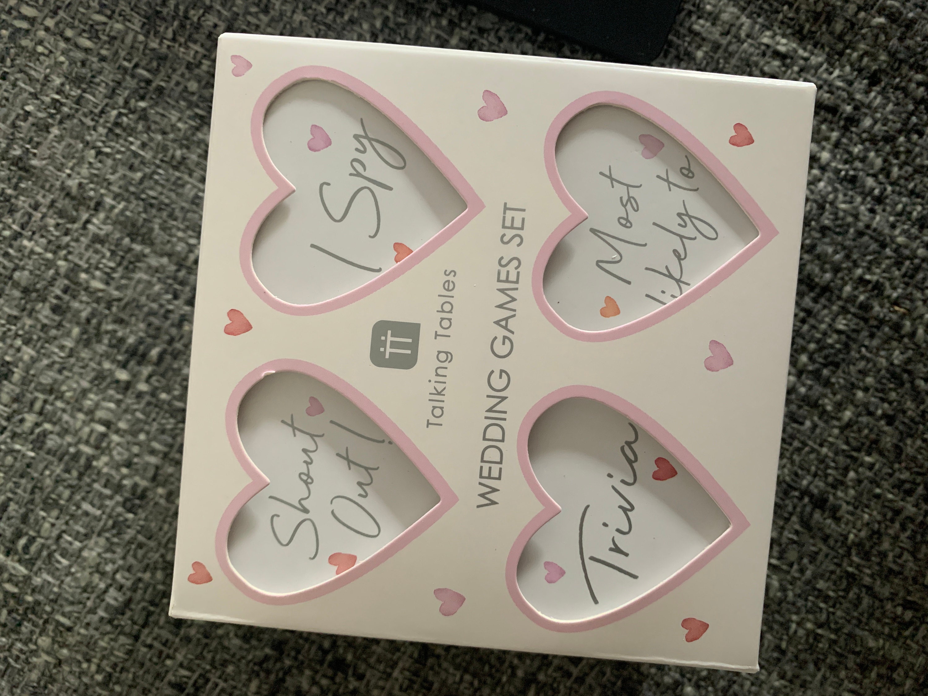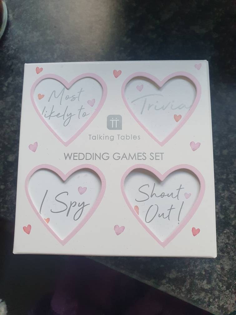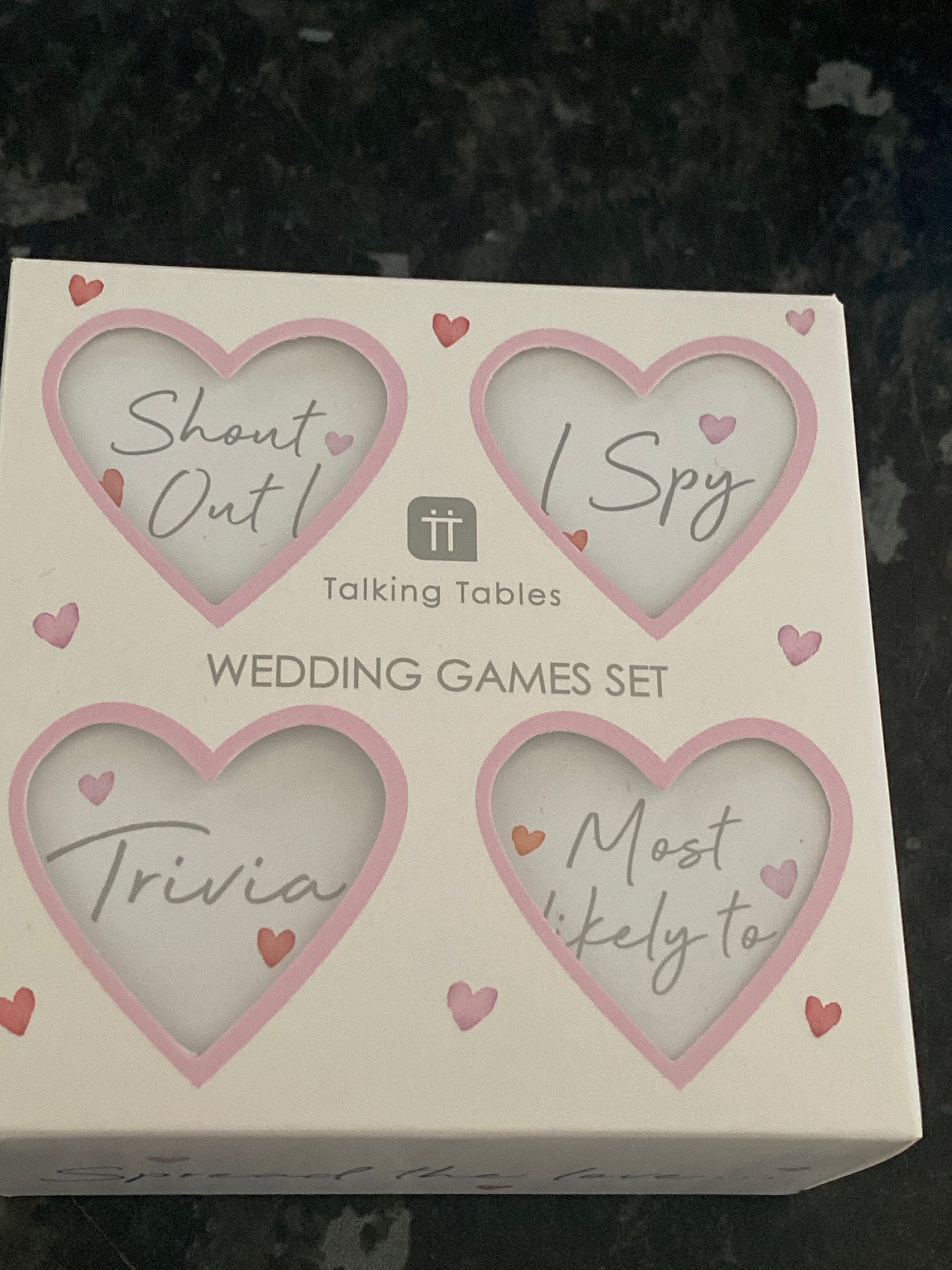 4 boxes of games including wedding editions of I spy, Most likely to, Shout out and Trivia.